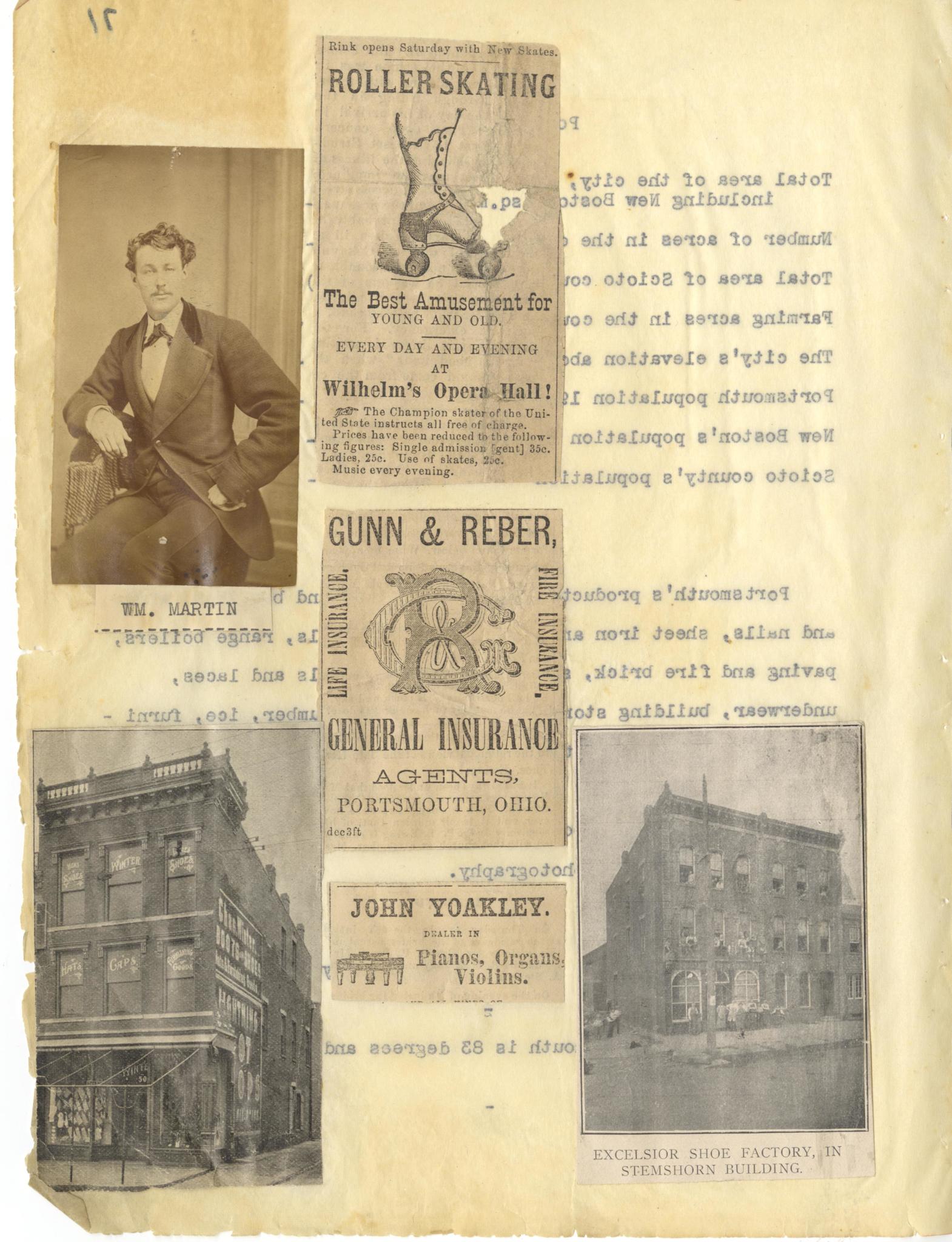 Henry A. Lorberg , “William Martin; Excelsior Shoe Factory in Stemhorn Building; Ads: Roller Skating at the Wilhelm Opera House, Gun & Reber General Insurance Agents, and John Yoakley, Pianos, Organs, Violins,” Scioto County Public Library Local History Digital Collection, accessed December 14, 2025, https://www.sciotolibrary.org/history/items/show/22876.