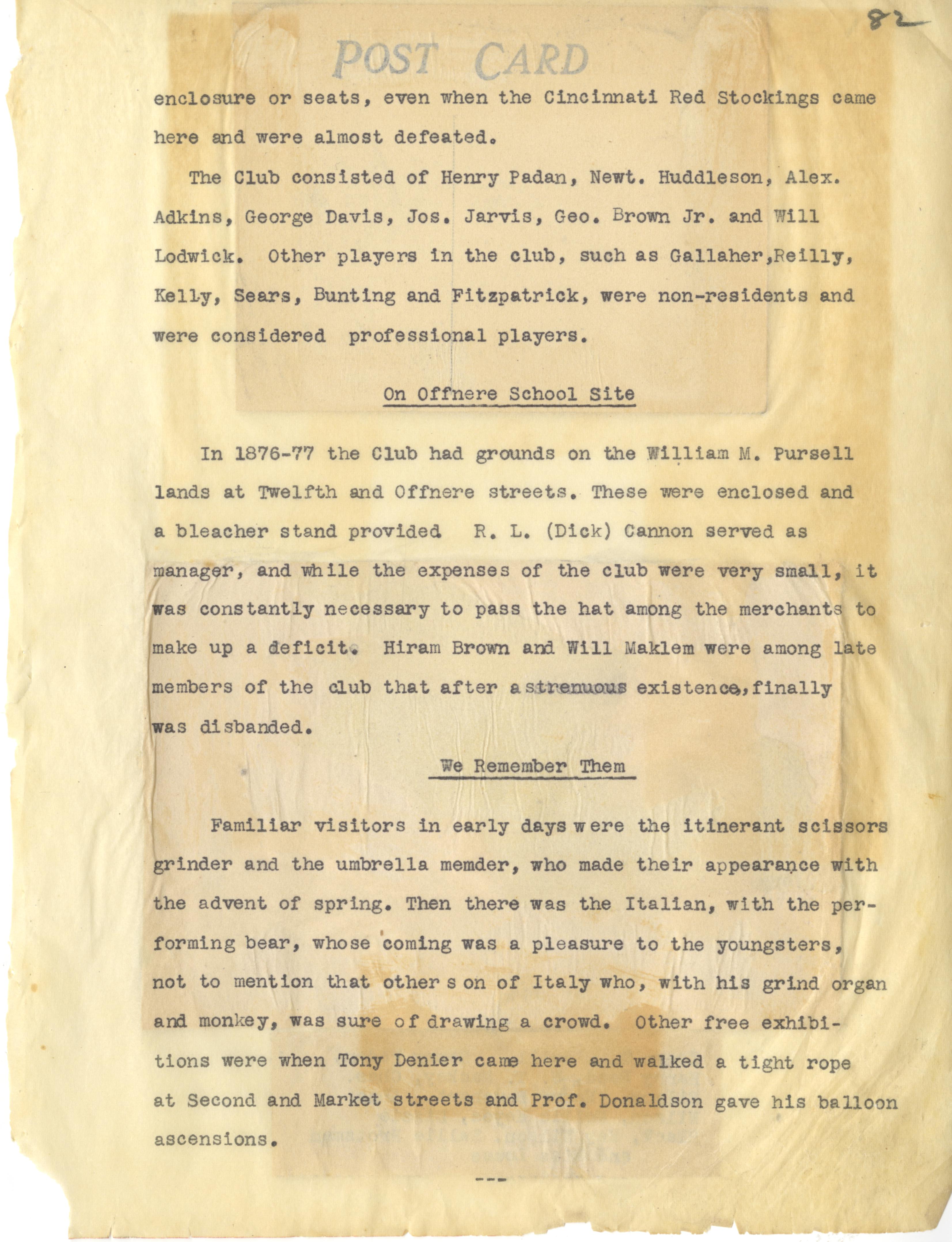- Photo image of scanned scrapbook page. Pictured: typed page with articles about On Offnere School Site; "We Remember Them:" Tightrope walker, balloon ascensions; The Club members: Henry Padan; Newt Huddleson; Alex Adkins; George Davis; Joe Jarvis; George Brown Jr.; Will Lodwick; William M. Pursell; R. L. Cannon; Hiram Brown; Will Maklem; Tony Denier; Prof. Donaldson