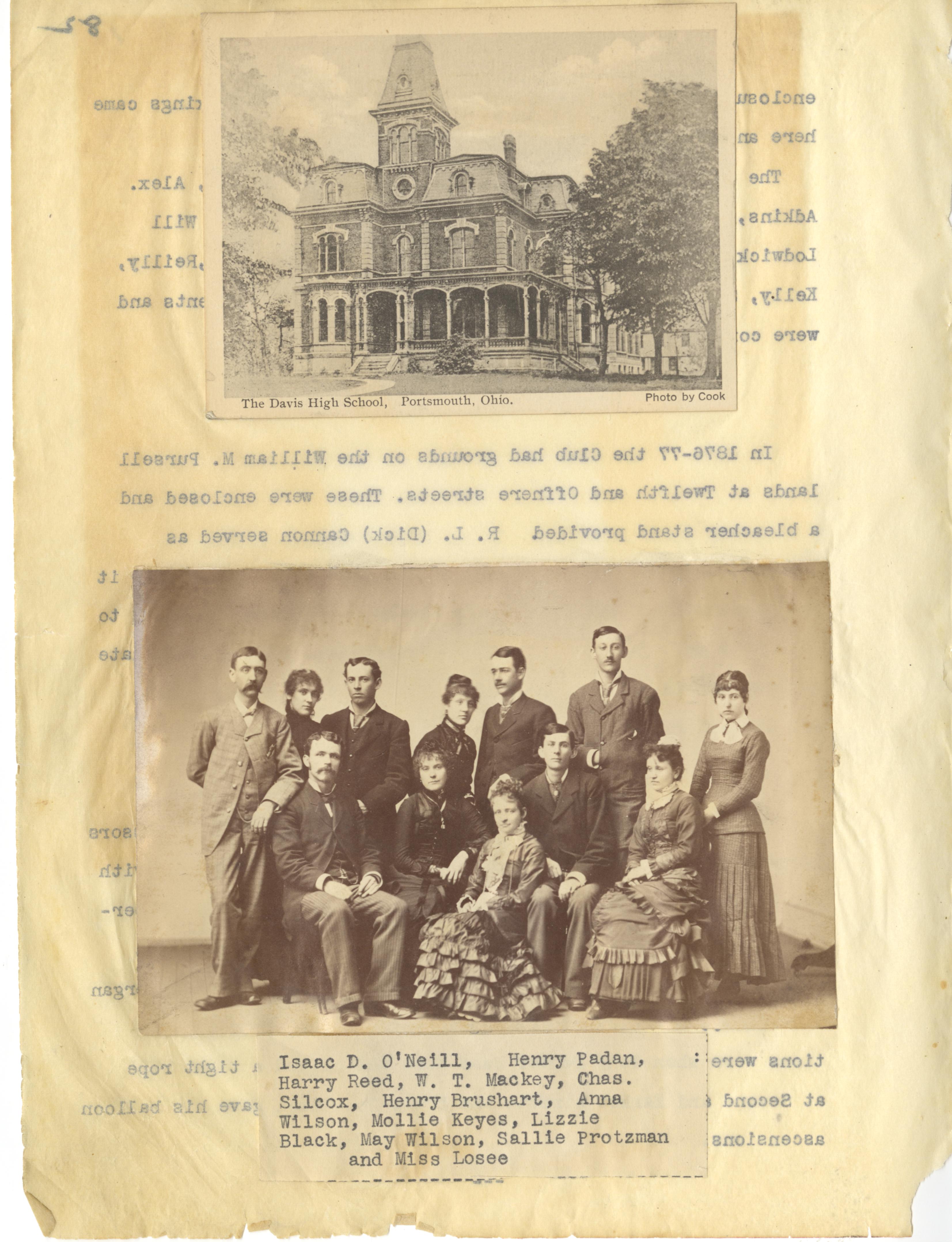 - Photo image of scanned scrapbook page. Pictured: The Davis High School; Group Photo: Isaac D. O'Neill, Henry Padan, Harry Reed, W. T. Mackey, Charles Silcox, Henry Brushart, Anna Wilson, Mollie Keyes, Lizzie Black, May Wilson, Sallie Protzman, and Miss Losee