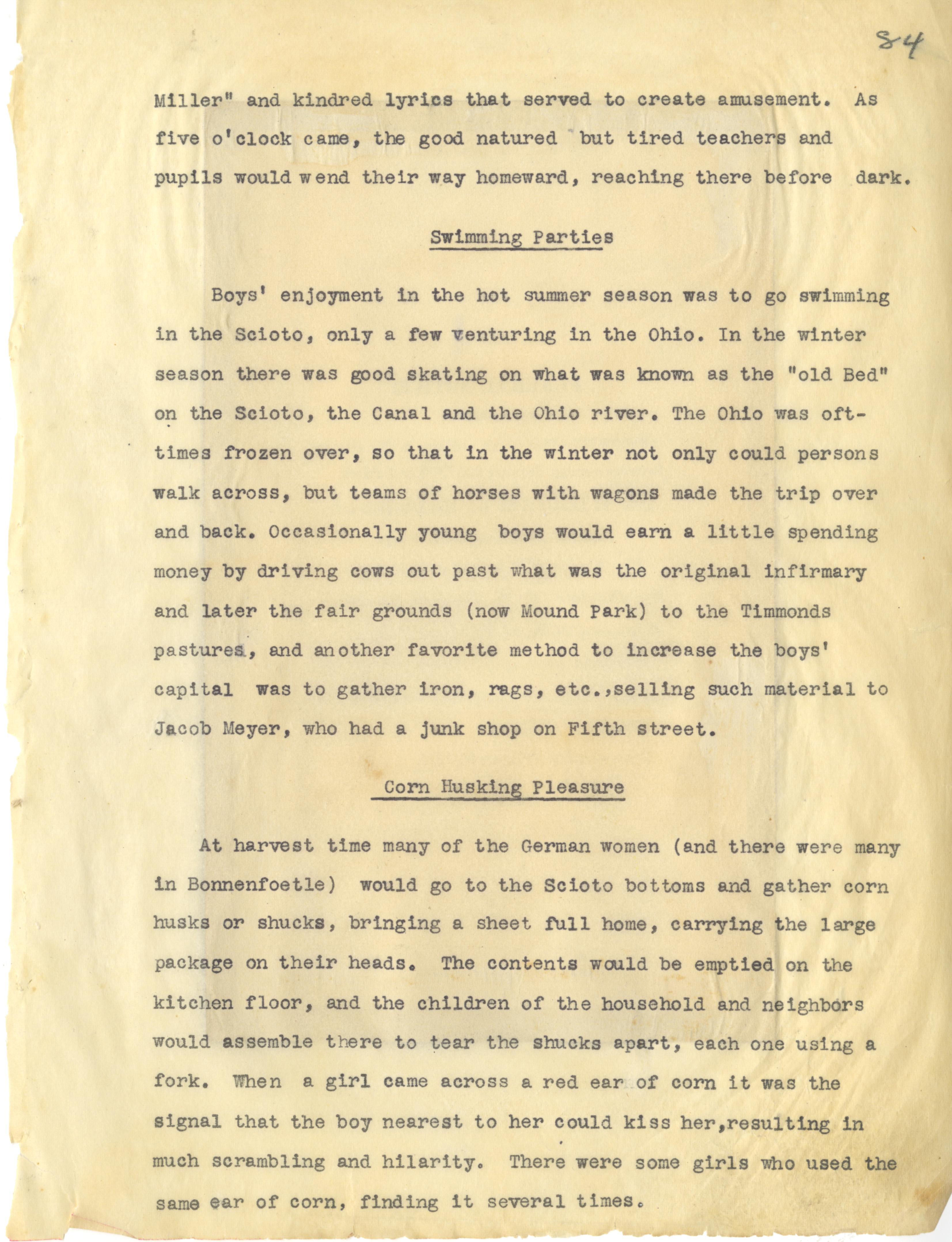 - Photo image of scanned scrapbook page. Pictured: typed articles about Swimming Parties; Corn Husking Pleasure; Infirmary; Mound Park; Timmonds Pastures; Scioto Bottoms; German population