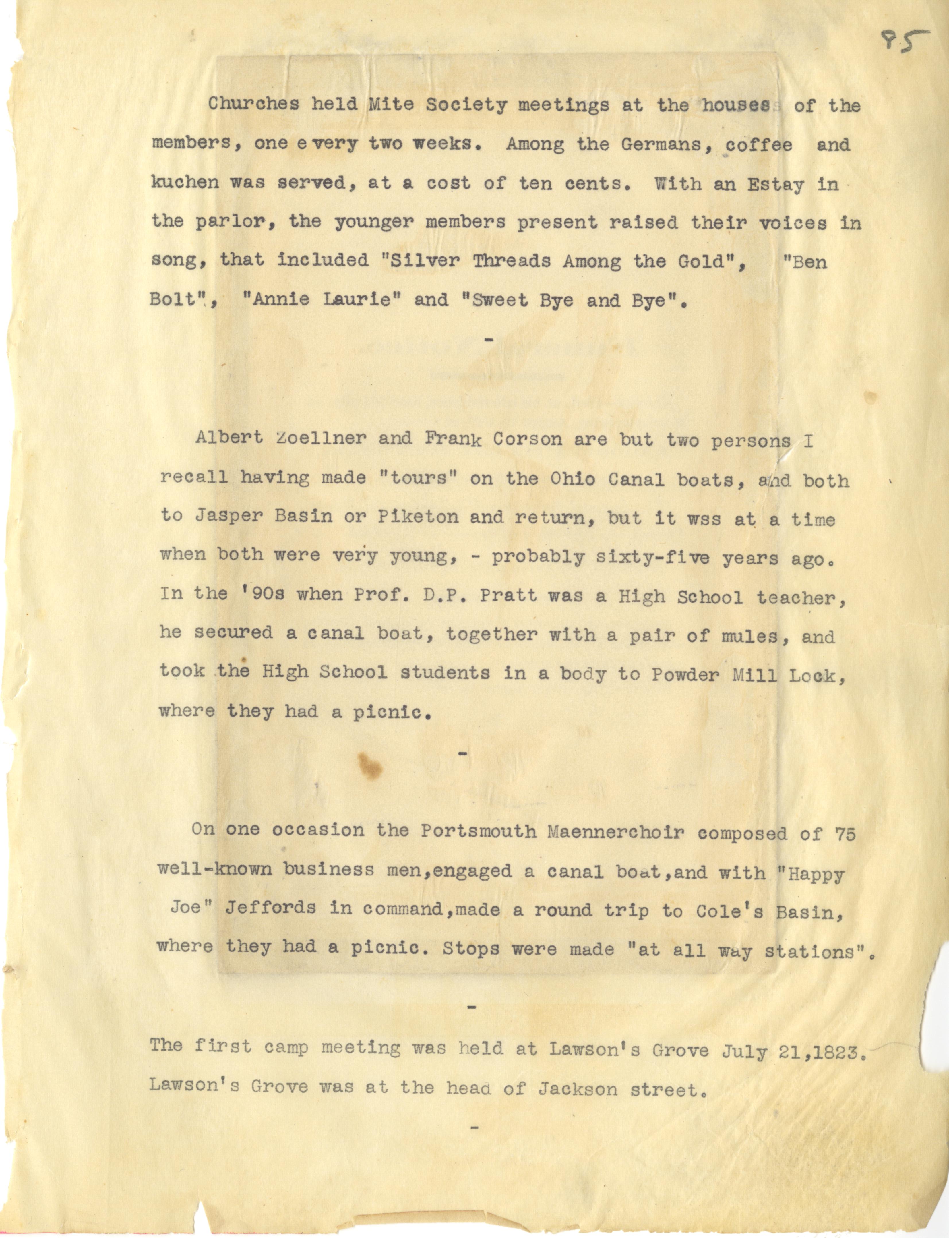 - Photo image of scanned scrapbook page. Pictured: typed page giving information about Albert Zoellner and Frank Corson, tours on the Ohio Canal Boats; Portsmouth Maennerchoir; Prof. D. P. Pratt; Lawson's Grove