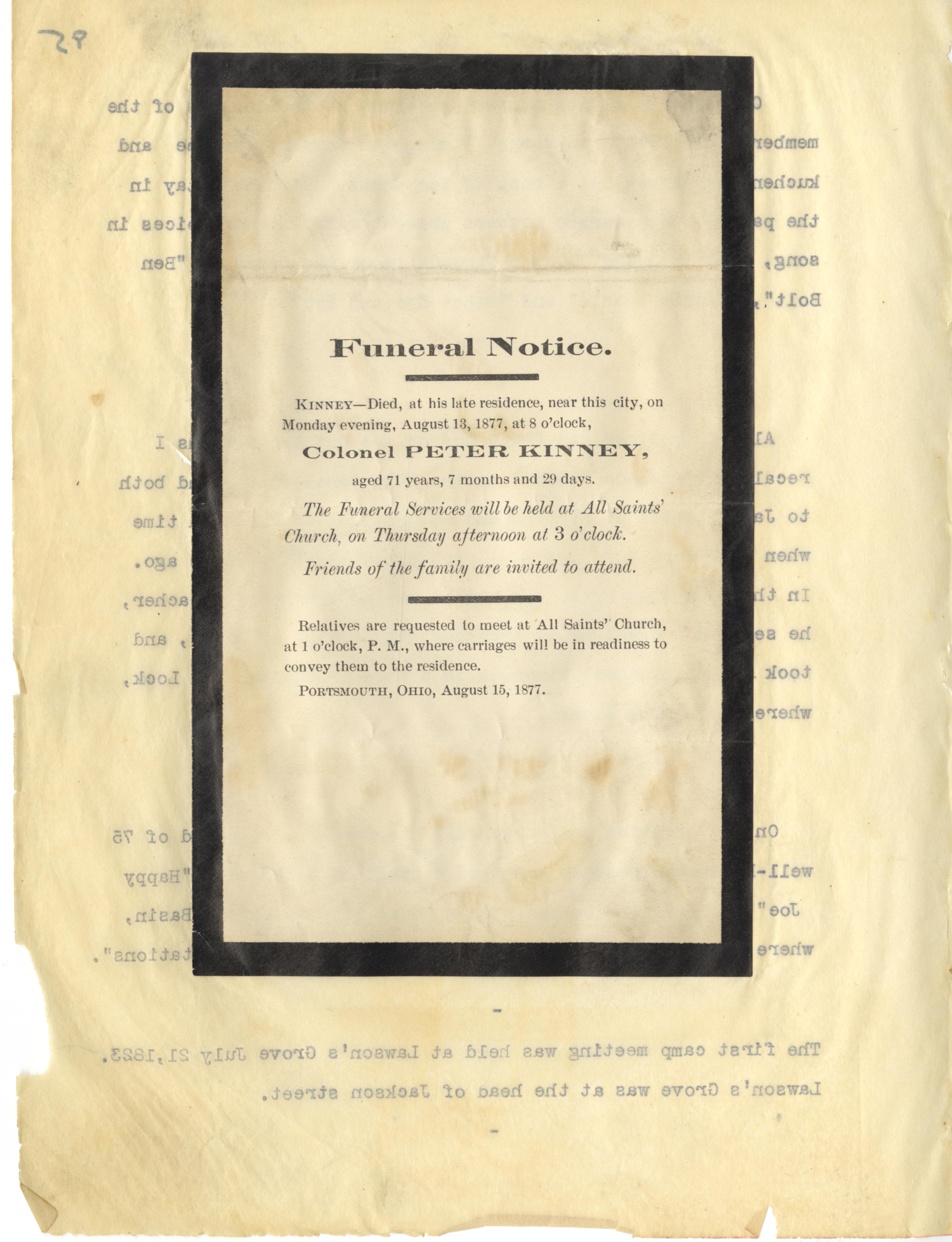 Henry A. Lorberg , “Funeral Notice of Col. Peter Kinney,” Scioto County Public Library Local History Digital Collection, accessed December 14, 2025, https://www.sciotolibrary.org/history/items/show/22904.