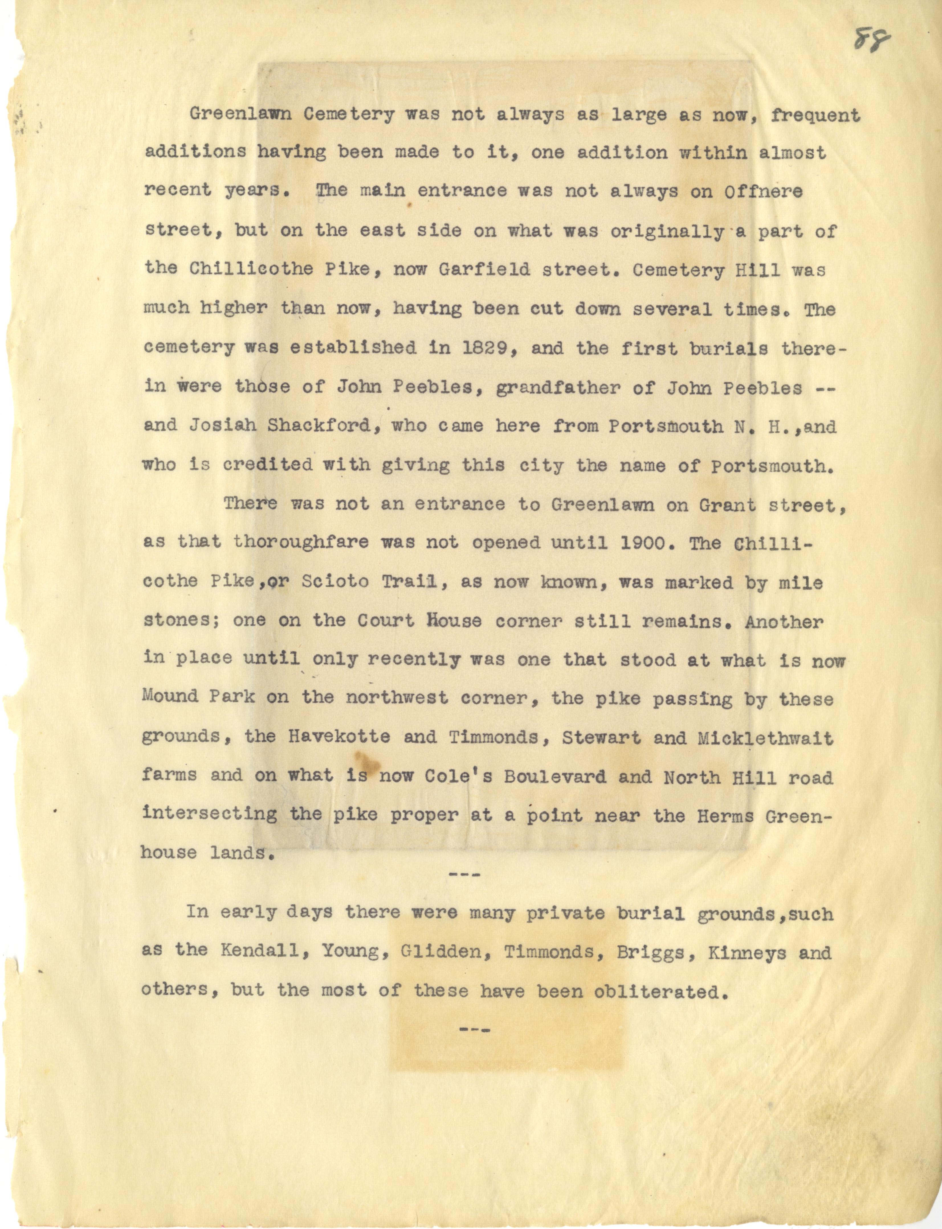 - Photo image of scanned scrapbook page. Pictured: typed page giving information about Greenlawn Cemetery; Offnere Street; Chillicothe Pike; Garfield Street; Cemetery Hill; John Peebles; Portsmouth N. H.; Josiah Shackford; Grant Street; Scioto Trail; Court House Corner; Timmonds; Stewart; Micklethwait; Kendall; Glidden; Briggs; Kinney