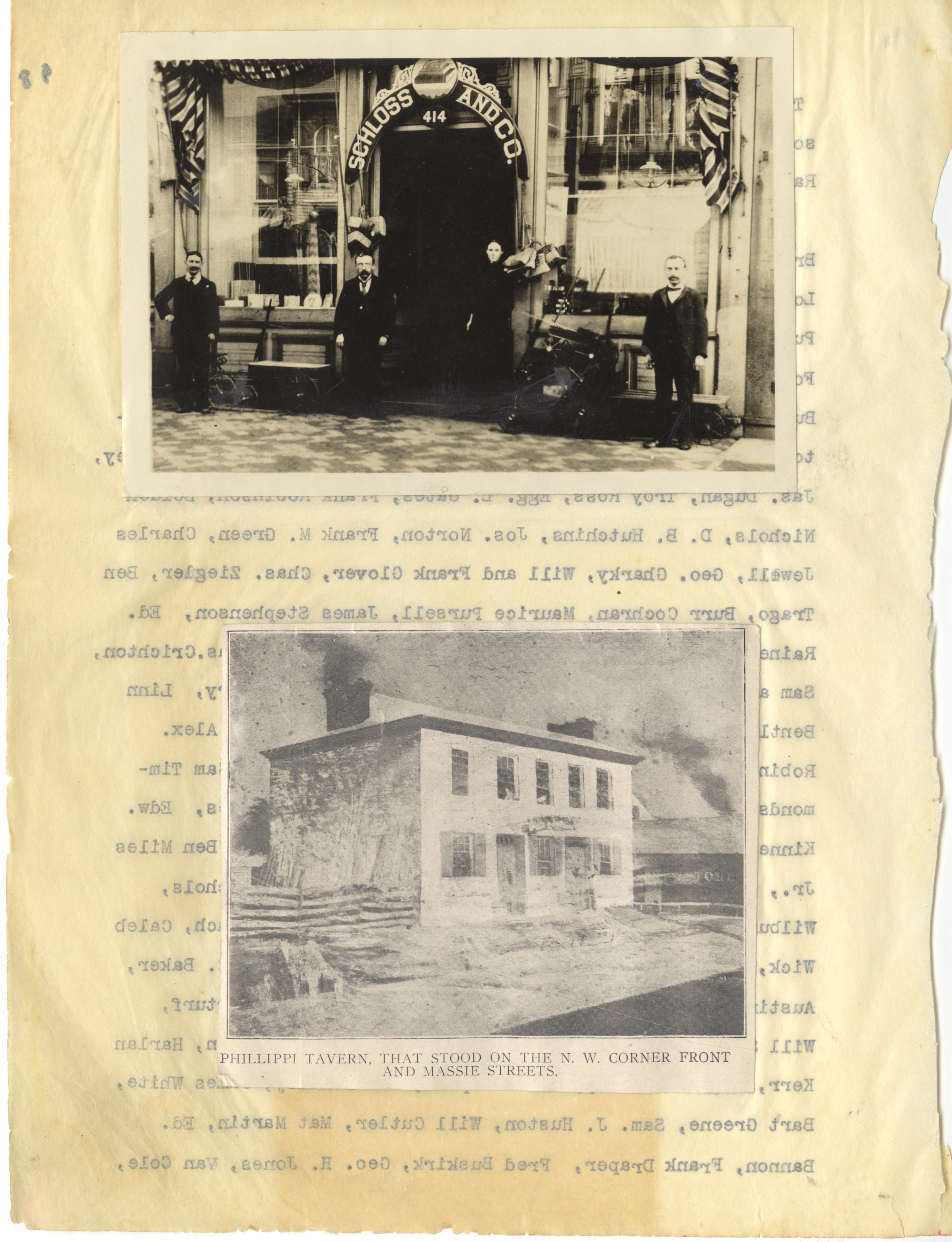 - Photo image of scanned scrapbook page. Pictured: Schloss and Co.; Phillippi Tavern that stood on the Northwest corner of Front and Massie Streets