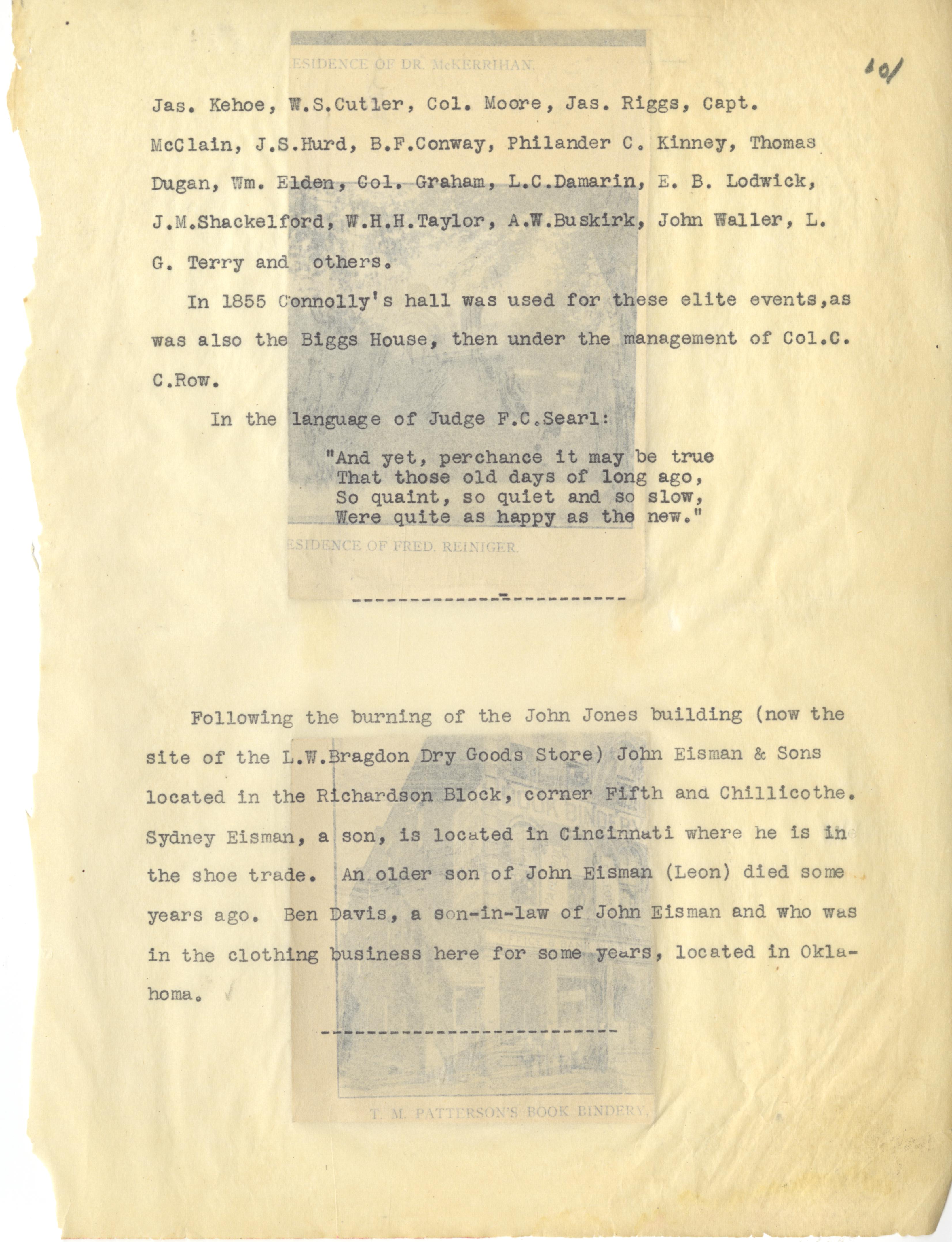 - Photo image of scanned scrapbook page. Pictured: typed page talking about the Burning of the John Jones Building; L. W. Bragdon Dry Goods Store; John Eisman & Sons; Richardson Block; Fifth (5th) and Chillicothe Streets; Ben Davis; Events in Portsmouth; James Kehoe; W. S. Cutler; Colonel Moore; James Riggs; Capt. McClain; J. S. Hurd; B. F. Conway; Philander C. Kinney; Thomas Dugan; William Elden; Col. Graham; L. C. Damarin; E. B. Lodwick; J. M. Shackelford; W. H. H. Taylor; A. W. Buskirk; John Waller; L. G. Terry; Connolly's Hall; Judge F. C. Searl;