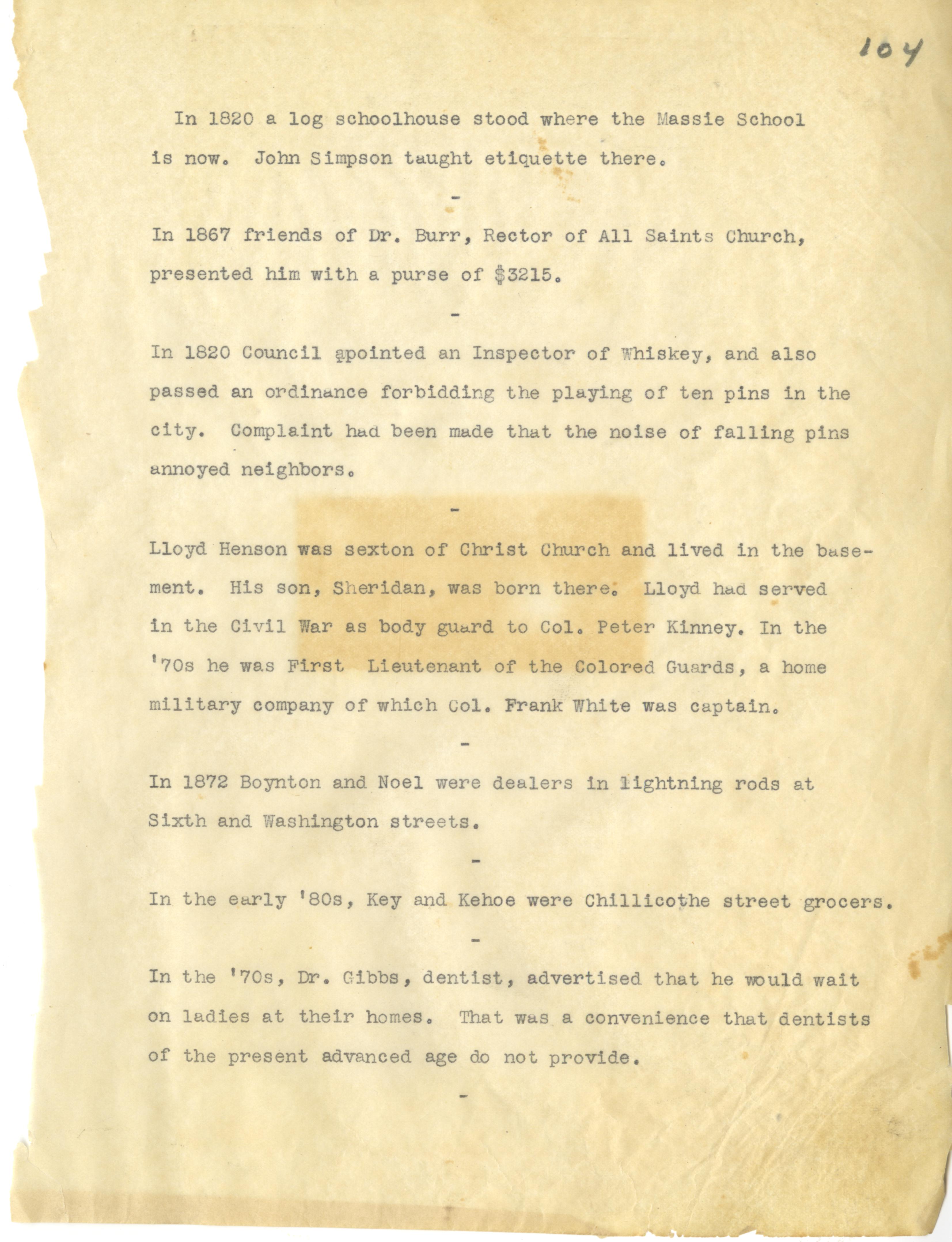 - Photo image of scanned scrapbook page. Pictured: typed page giving information about local businesses; John Simpson; Dr. Burr; All Saints Church; Inspector of Whiskey; Lloyd Henson; Christ Church; Peter Kinney; Colored Guards; Frank White; Boynton & Noel at Sixth and Washington; Key and Kehoe on Chillicothe Street; Dr. Gibbs