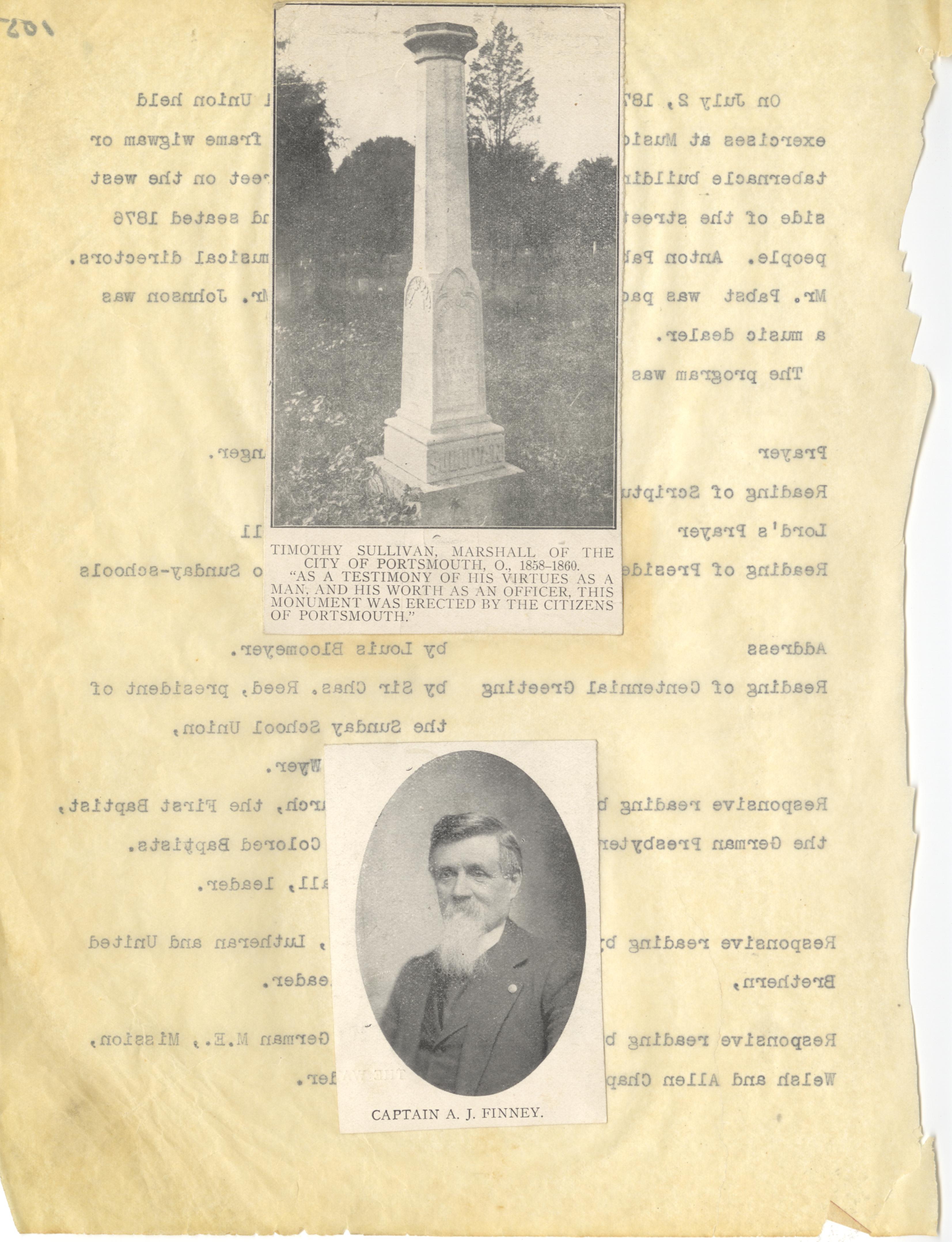 - Photo image of scanned scrapbook page. Pictured: Headstone for Timothy Sullivan, Marshall of the city of Portsmouth from 1858 to 1860; Captain A. J. Finney