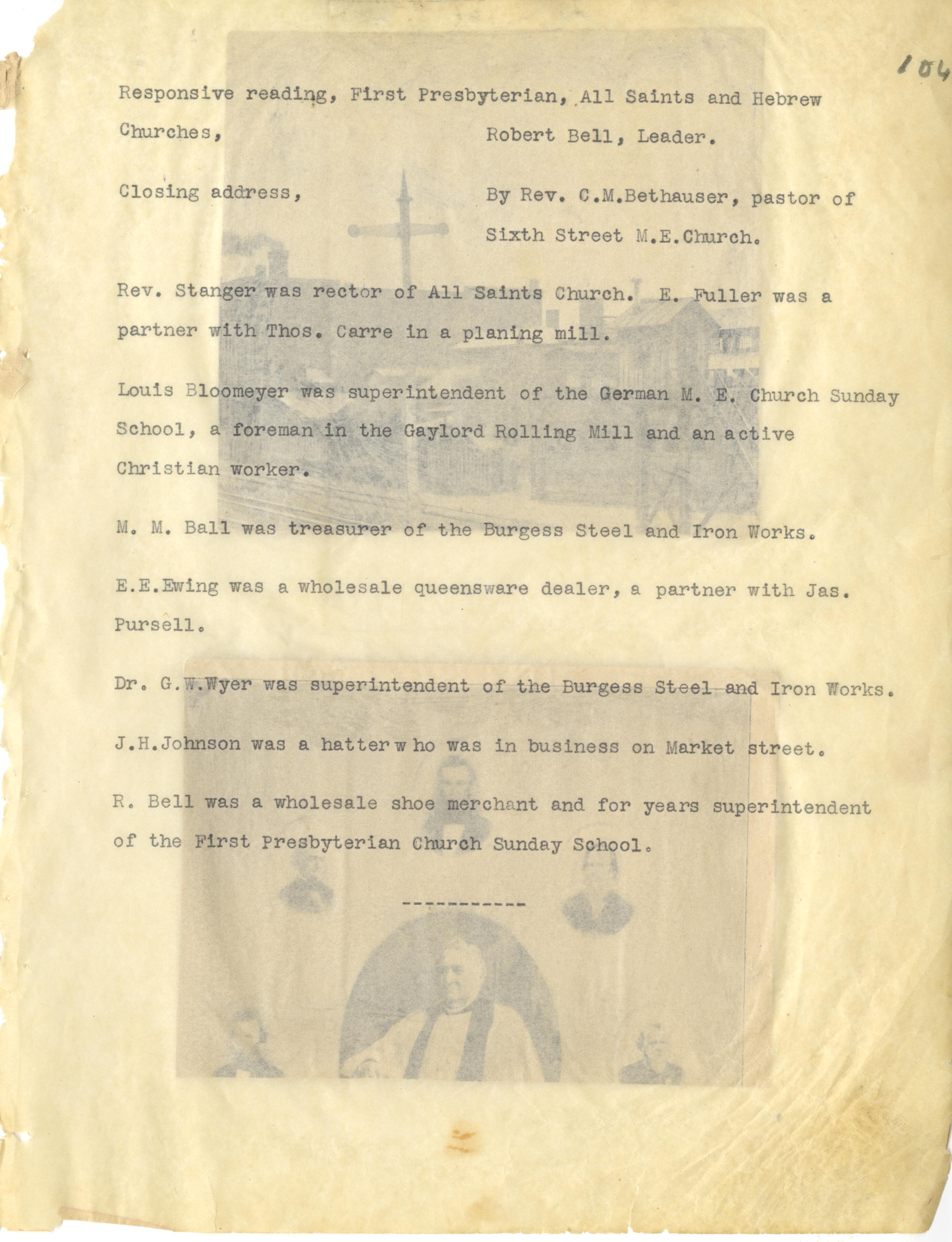 - Photo image of scanned scrapbook page. Pictured: typed page giving brief information about some Portsmouth residents; Robert Bell; Rev. C. M. Bethauser; Sixth (6th) Street M. E. Church; Rev. Stanger; E. Fuller; Thos. Carre; Louis Bloomeyer; Gaylord Rolling Mills; M. M. Ball; E. E. Ewing; Dr. G. W. Wyer; Burgess Steel and Iron Works; J. H. Johnson; R. Bell; First Presbyterian Church Sunday School