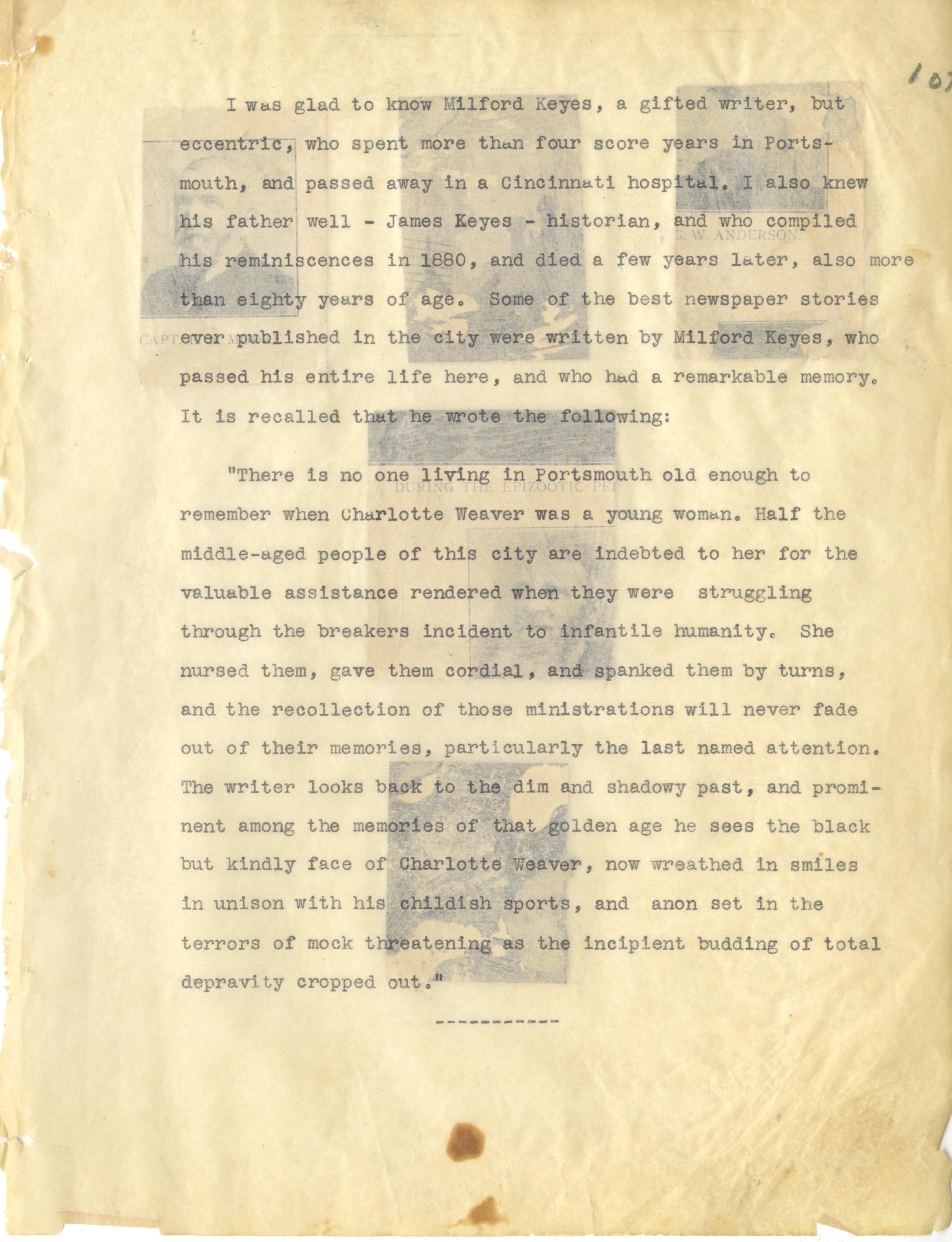 - Photo image of scanned scrapbook page. Pictured: typed page giving information about Milford Keyes, notable writer and historian of Portsmouth