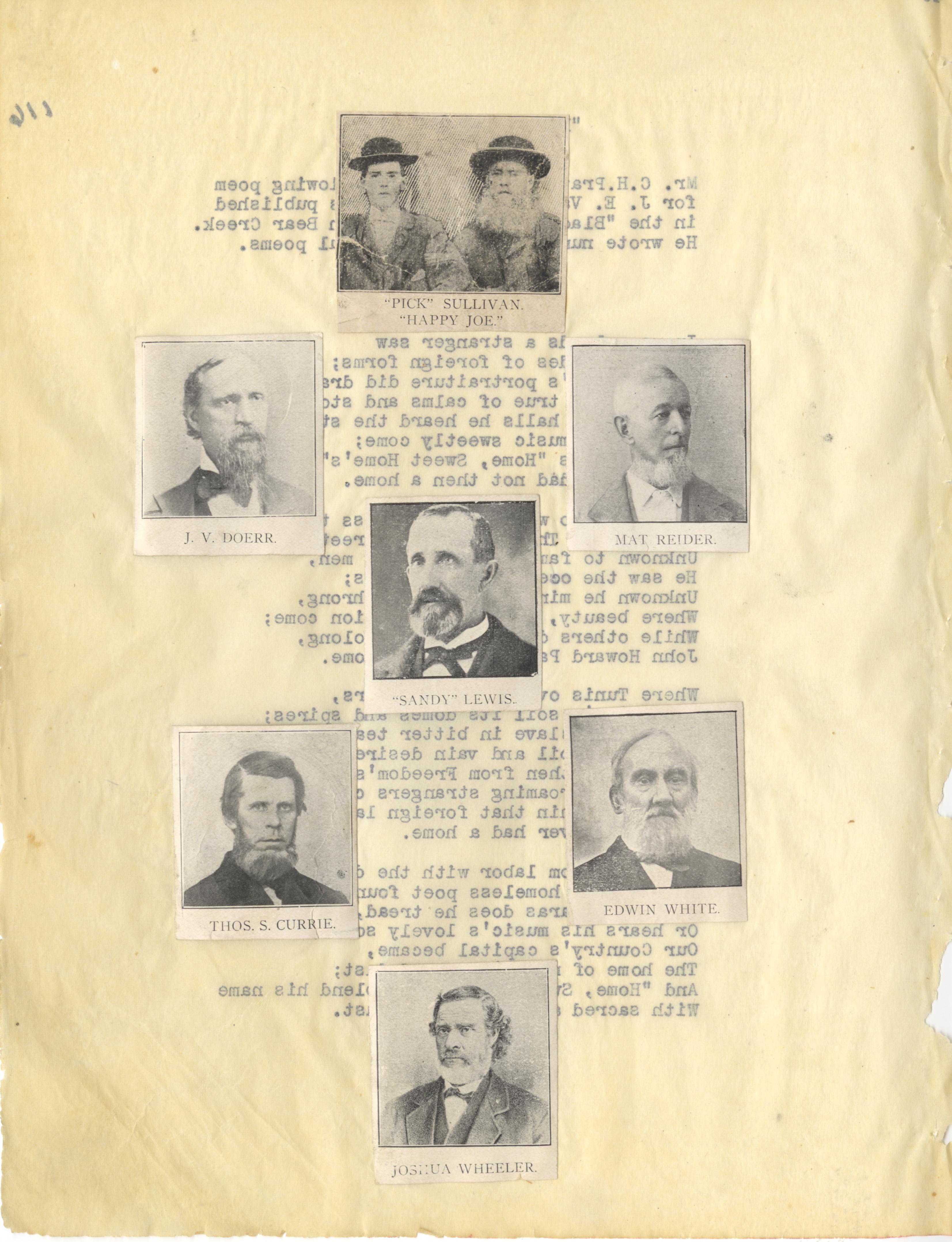 - Photo image of scanned scrapbook page. Pictured: "Pick" Sullivan and "Happy Joe;" J. V. Doerr; "Sandy" Lewis; Mat Reider; Thomas S. Currie; Edwin White; Joshua Wheeler