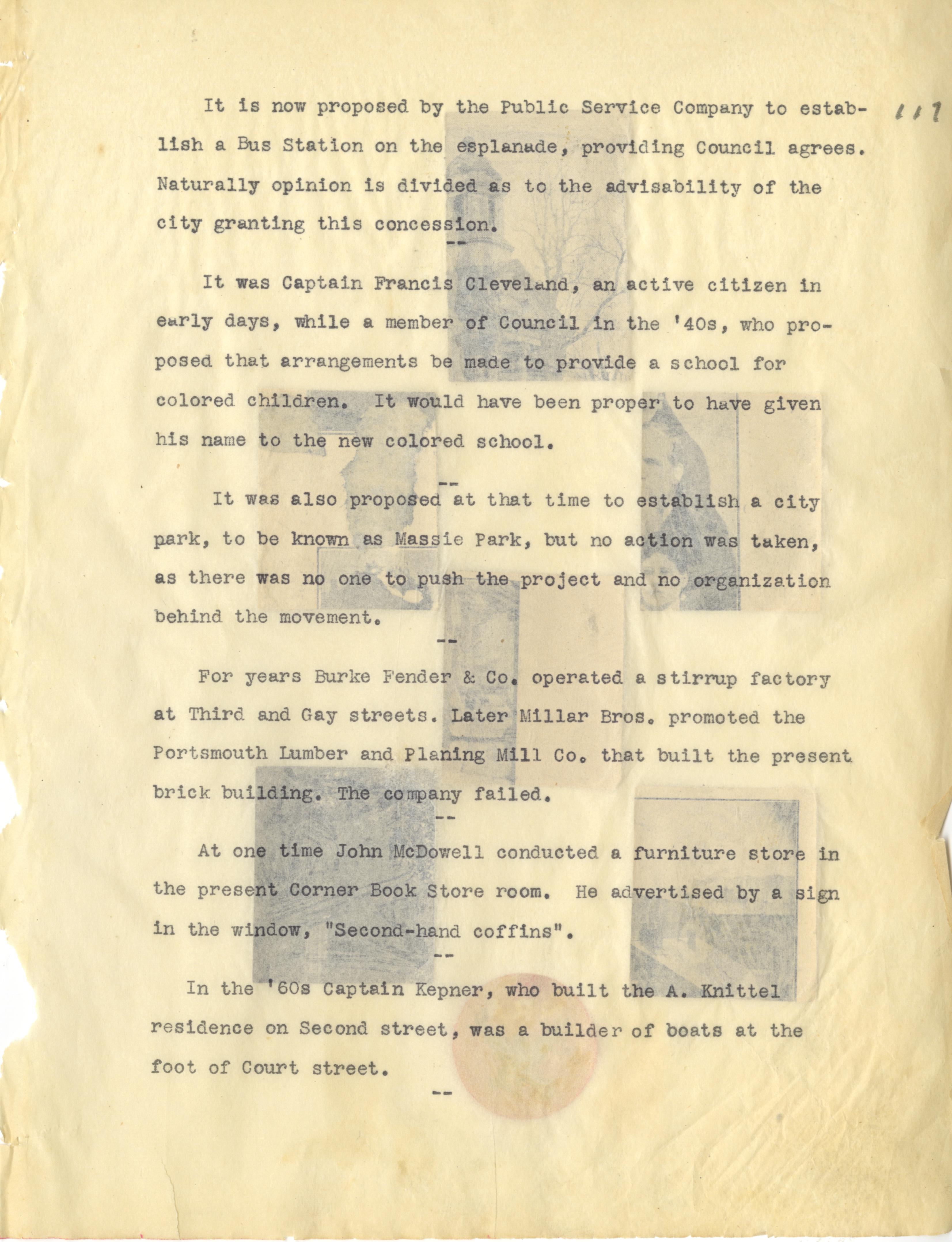 - Photo image of scanned scrapbook page. Pictured: typed page giving some brief descriptions of some City Council propositions; Captain Francis Cleveland; Public Service Company; Colored School; Massie Park; Burke Fender & Co. at Third (3rd) and Gay Streets; Portsmouth Lumber and Planing Mill Co.; John McDowell; Corner Book Store; Captain Kepner; A. Knittel Residence on Second (2nd) Street