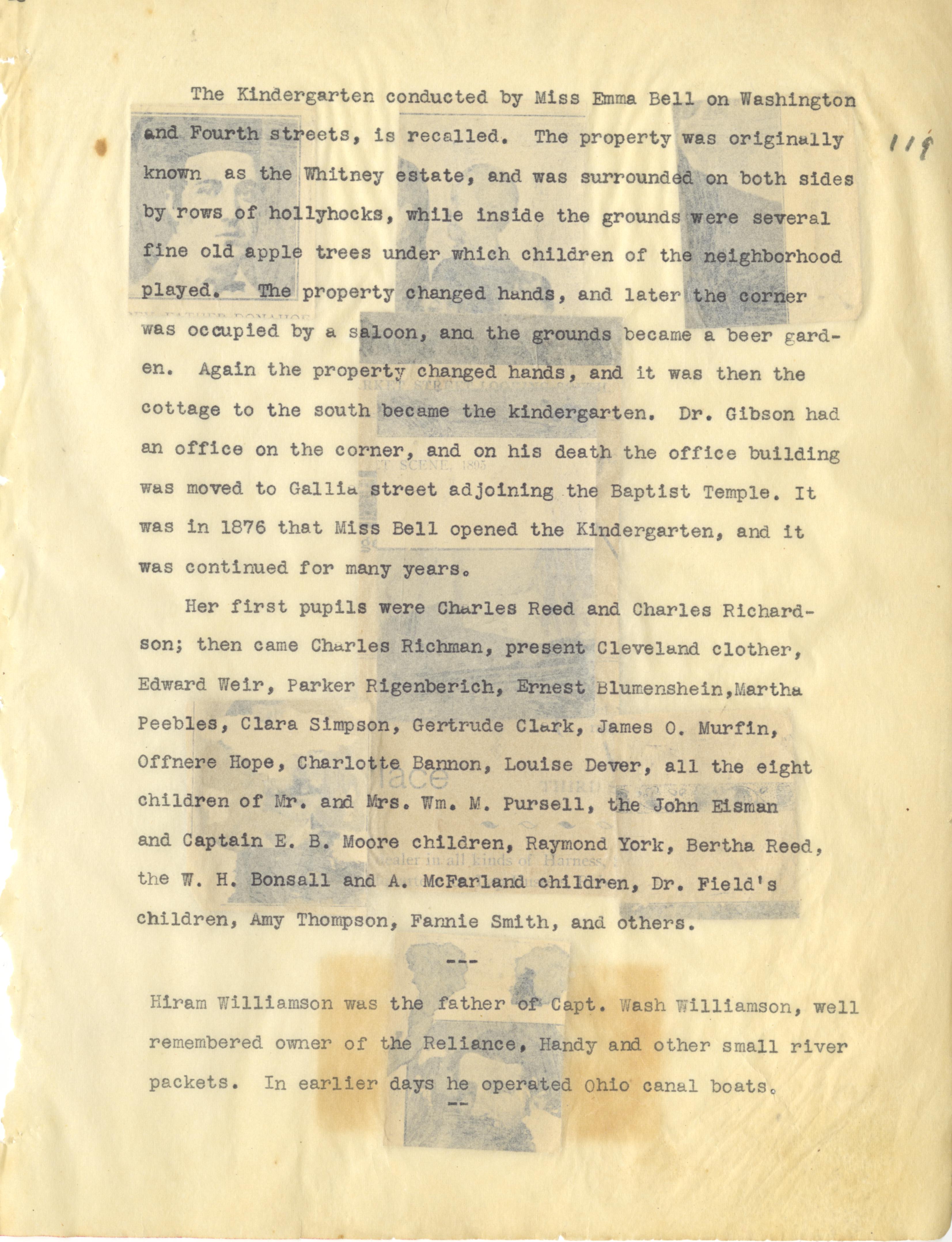 - Photo image of scanned scrapbook page. Pictured: typed page about property changes at the corner of Washington and Fourth (4th) Streets; Emma Bell's Kindergarten; saloon; beer garden; Dr. Gibson; Charles Reed; Charles Richardson; Charles Richman; Edward Weir; Parker Rigenberich; Ernest Blumenshein; Martha Peebles; Clara Simpson; Gertrude Clark; James O. Murfin; Offnere Hope; Charlotte Bannon; Louise Dever; Children of Mr. and Mrs. Pursell; John Eisman's children; children of E. B. moore; Raymond York; Bertha Reed; W. H. Bonsall; A. McFarland's children; Dr. Field's children; Amy Thompson; Fannie Smith; Hiram Williamson; Captain Wash Williamson; Reliance; Handy; Ohio Canal boats