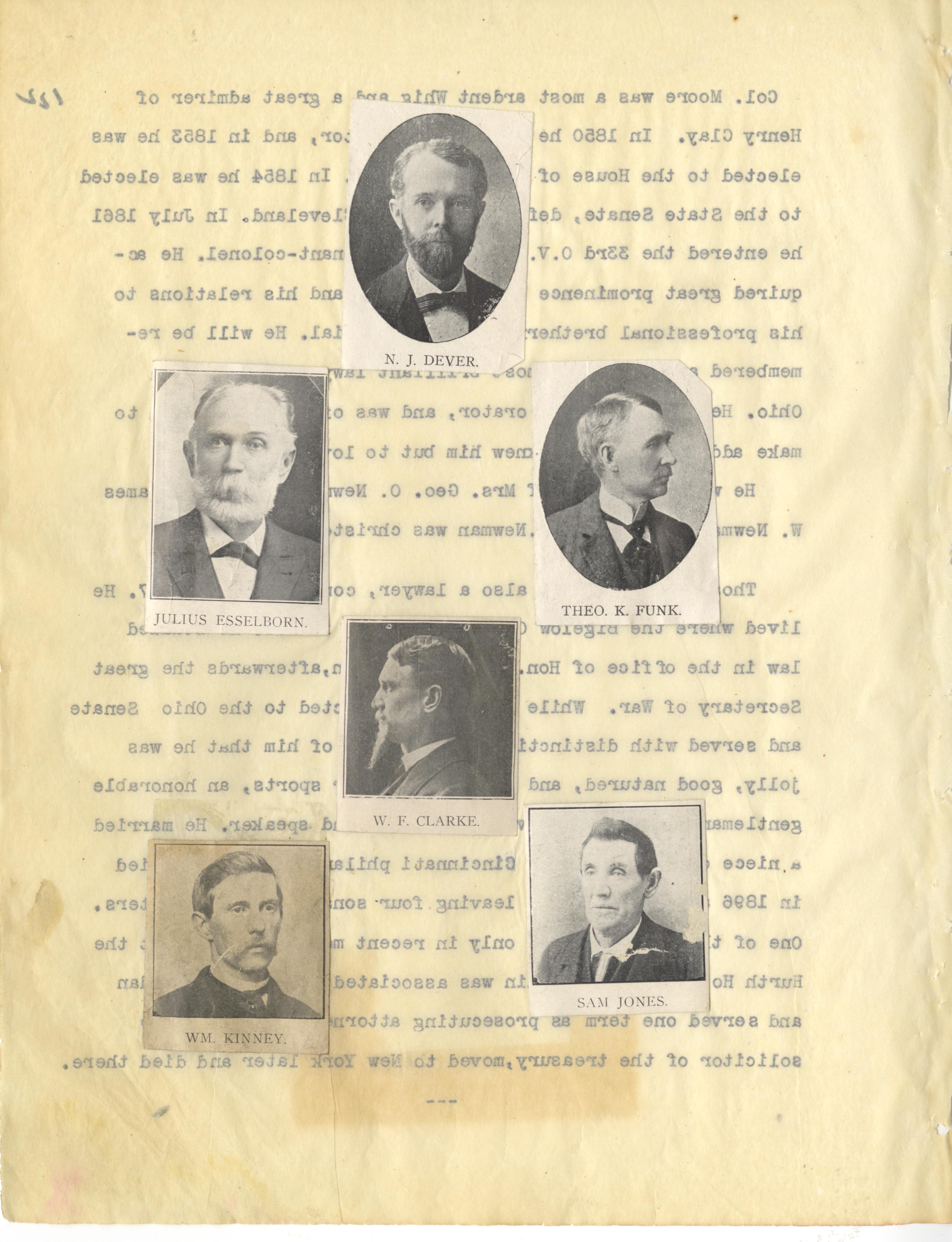 - Photo image of scanned scrapbook page. Pictured: N. J. Dever; Julius Esselborn; Theodore K. Funk; W. F. Clarke; William Kinney; Sam Jones; M. B. Gilbert; J. W. Mitchell; the Portsmouth Blade; C. E. Erwin, early editor of the Republican