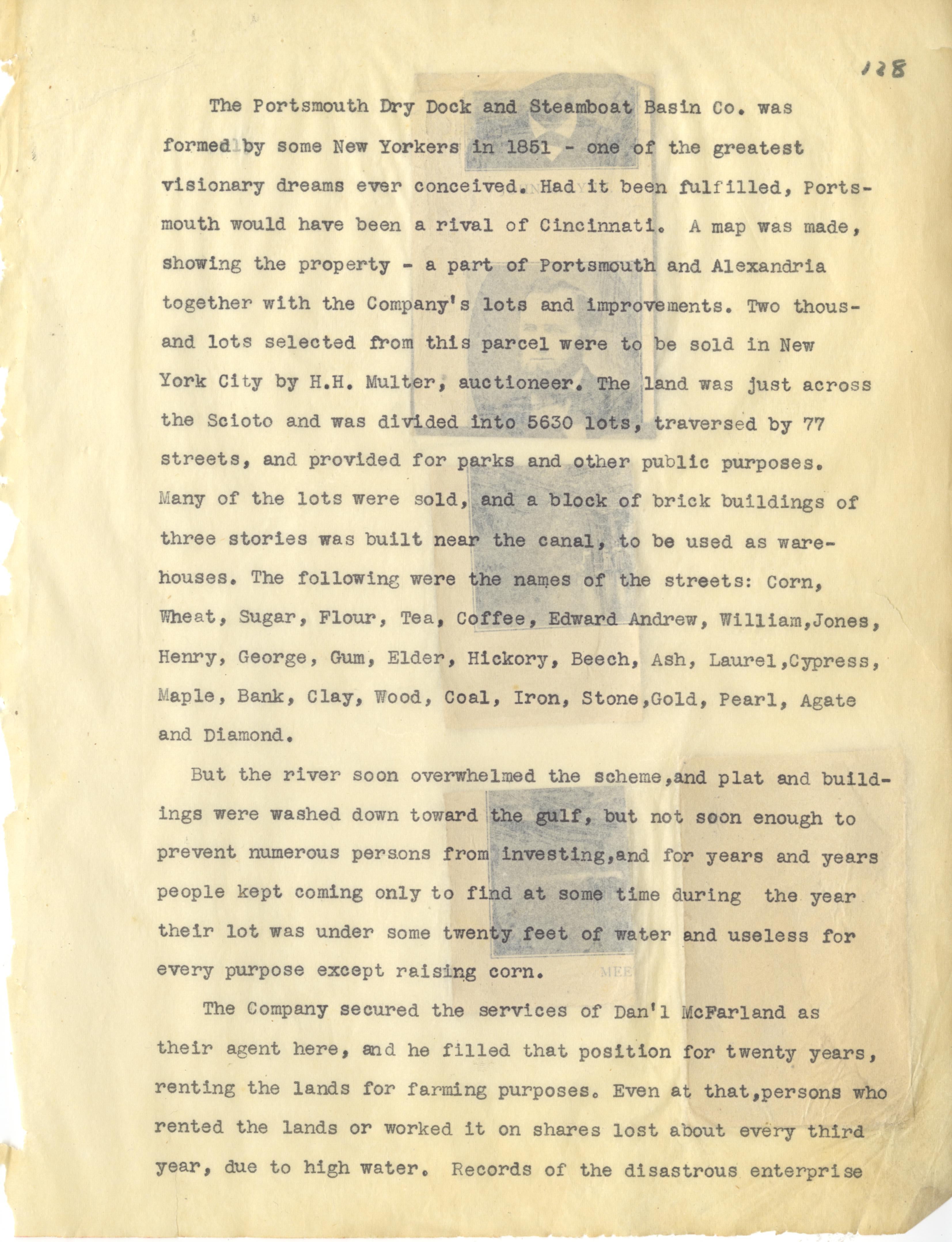 - Photo image of scanned scrapbook page. Pictured: typed page giving information about the Portsmouth Dry Dock and Basin Company; Portsmouth; Alexandria; H. H. Multer; Canal; Daniel McFarland; flood; Ohio River