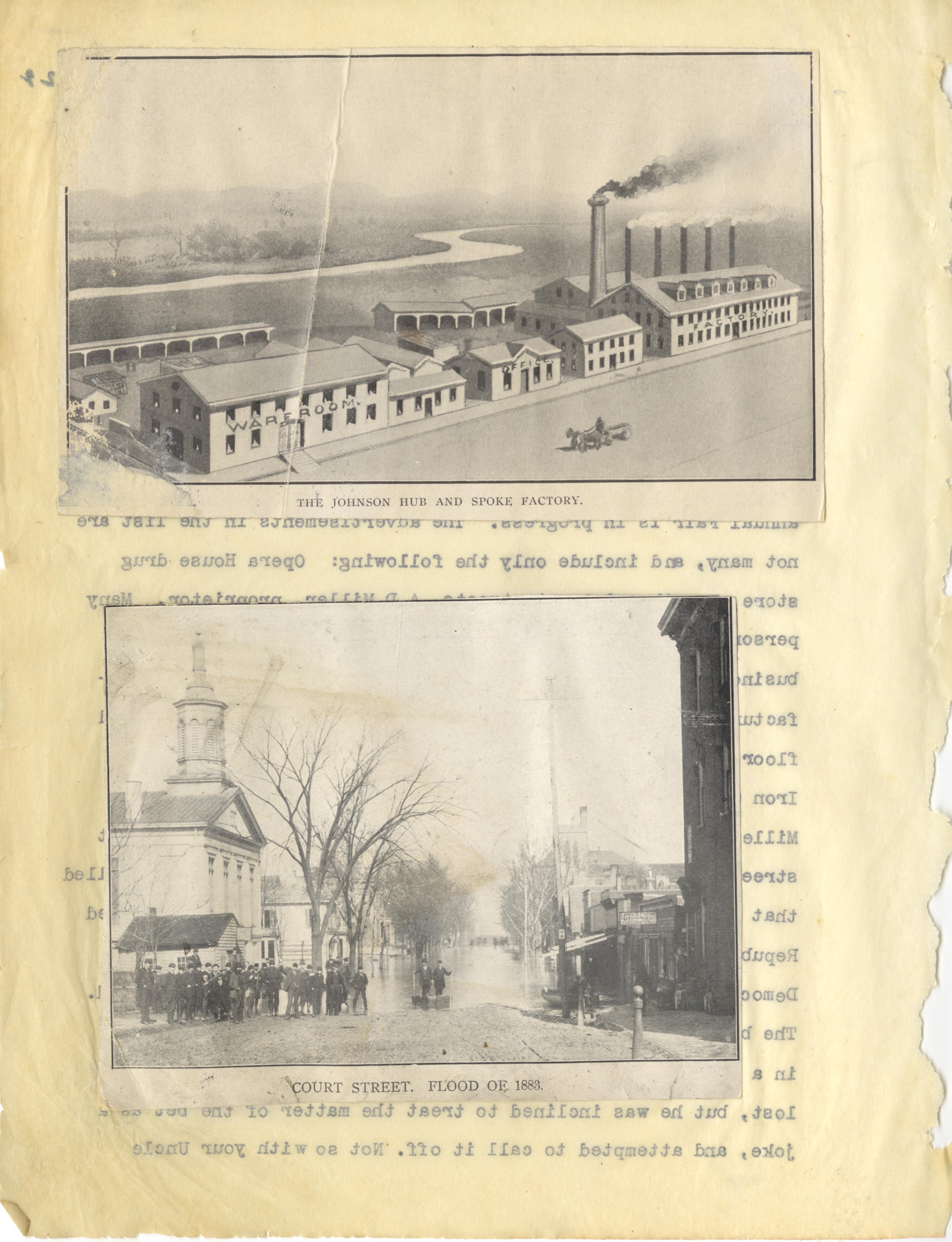 - Photo image of scanned scrapbook page. Pictured: The Johnson Hub and Spoke Factory; Court Street Flood of 1883