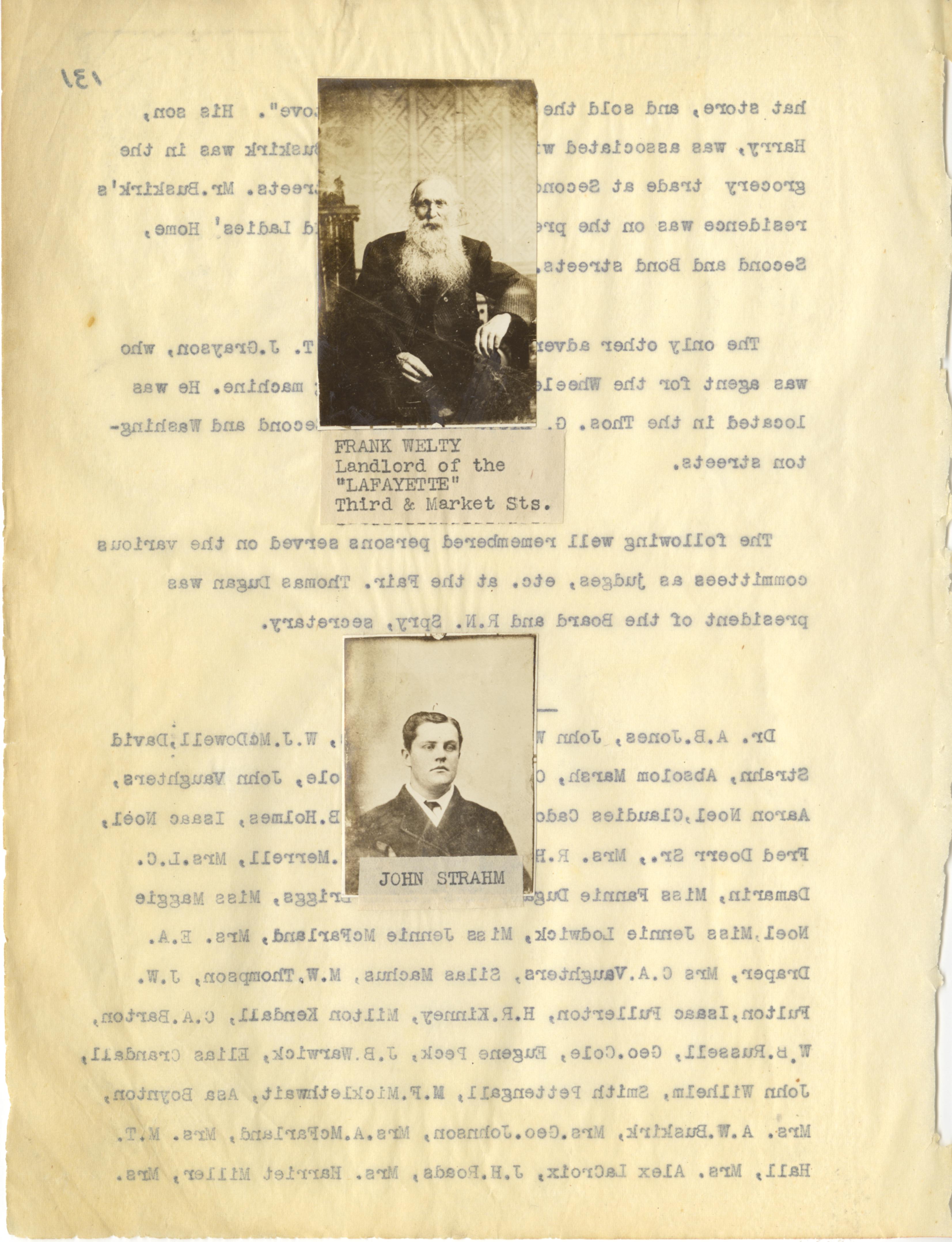 - Photo image of scanned scrapbook page. Pictured: Frank Welty, Landlord of "Lafayette" at Third (3rd) and Market Streets; John Strahm