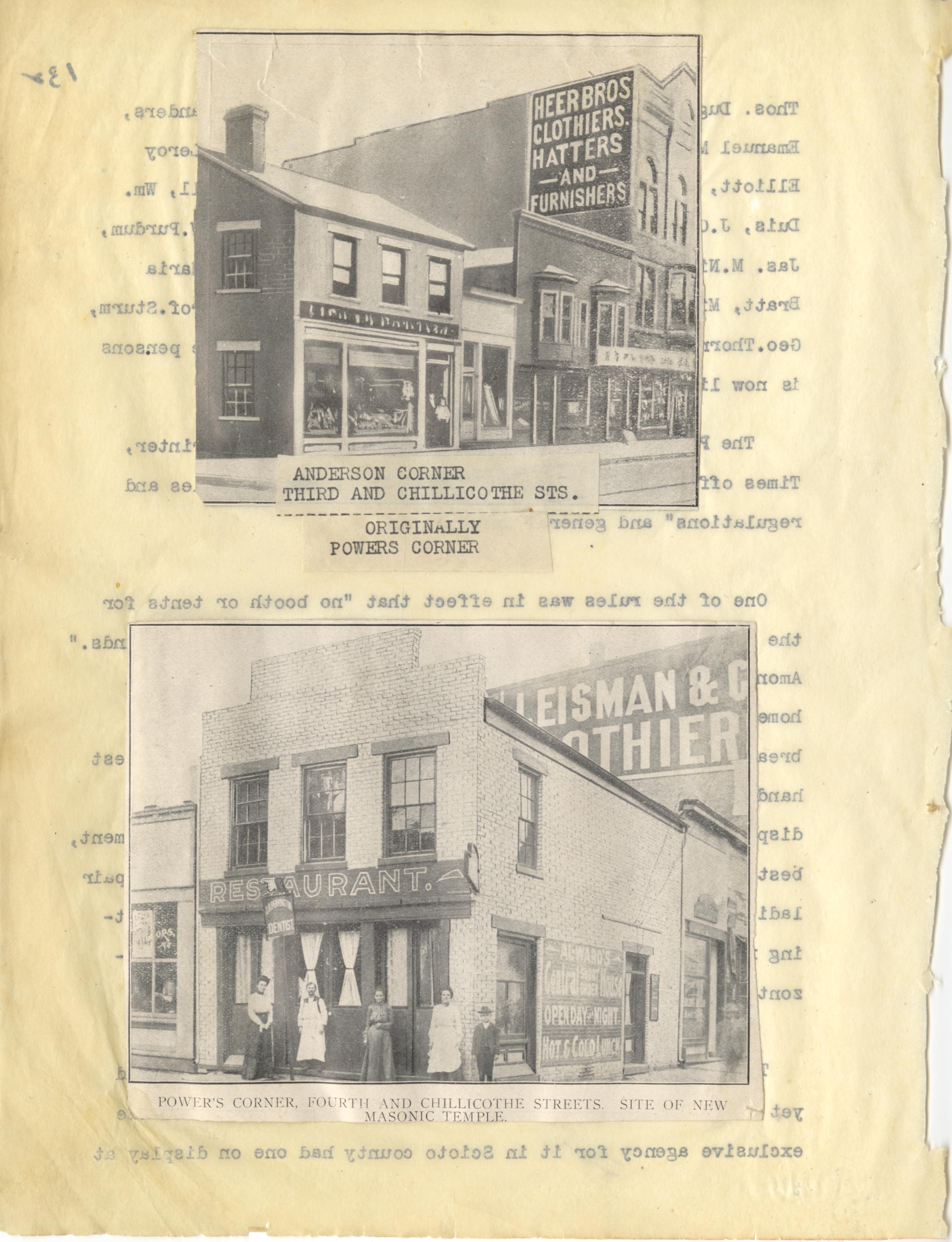 - Photo image of scanned scrapbook page. Pictured: Anderson Corner at Third (3rd) and Chillicothe Streets. This was originally known as Powers Corner. also shown is Powers Corner at Fourth (4th) and Chillicothe Streets, future site of Portsmouth's second Masonic Temple Building which was built in 1906.