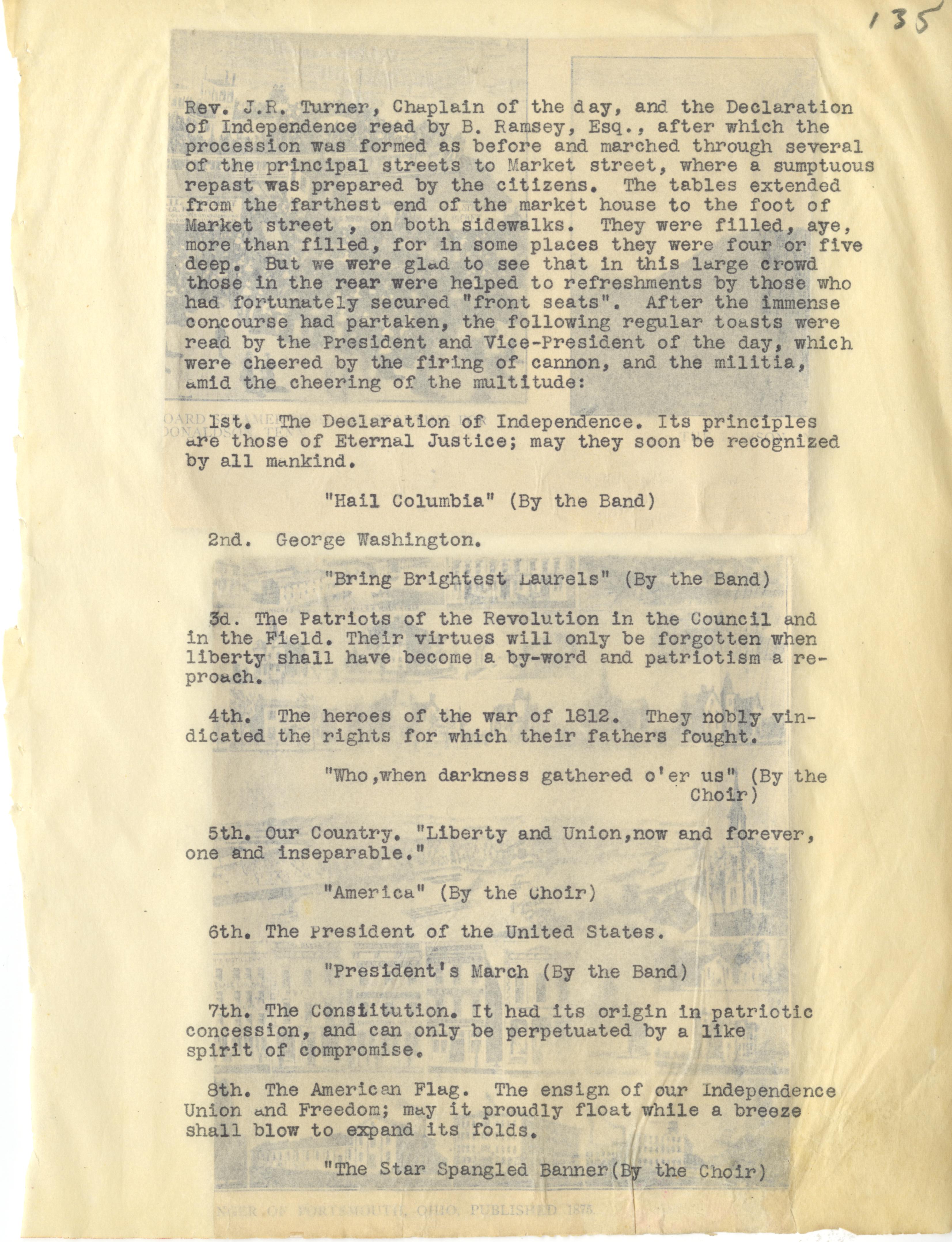 - Photo image of scanned scrapbook page. Pictured: typed page of the continuation of the July Fourth Celebration conducted by Captain Edward Hamilton; Rev. J. R. Turner; the Declaration of Independence
