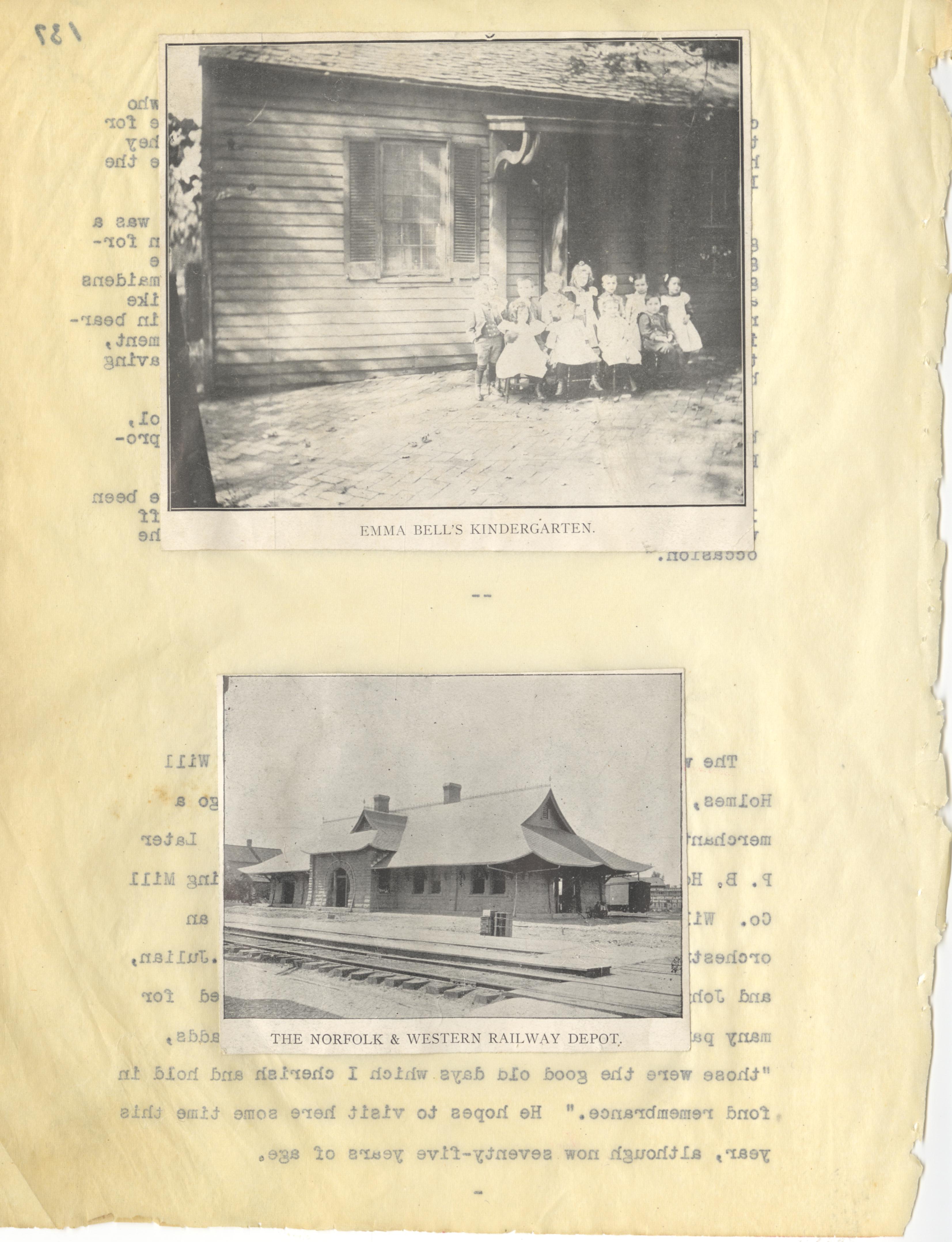 - Photo image of scanned scrapbook page. Pictured: black and white photos: Emma Bell's Kindergarten; the Norfolk and Western Railway Depot