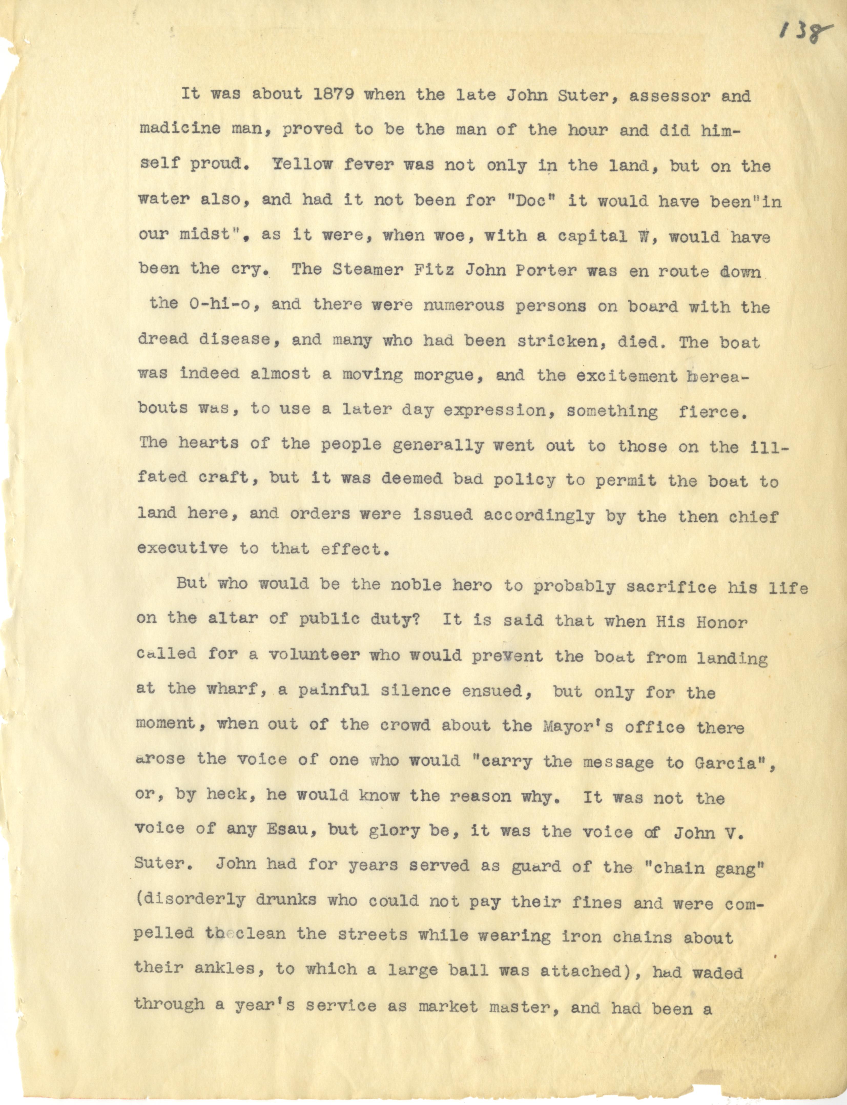 - Photo image of scanned scrapbook page. Pictured is a typed page telling of a story in 1879 in which John Suter made sure a ship did not come into the Portsmouth Wharf. The vessel was populated with people that had Yellow Fever, and it was feared that the disease would spread if it reached the city; Yellow Fever; Steamer Fitz John Porter; "Doc" Suter; Wharf