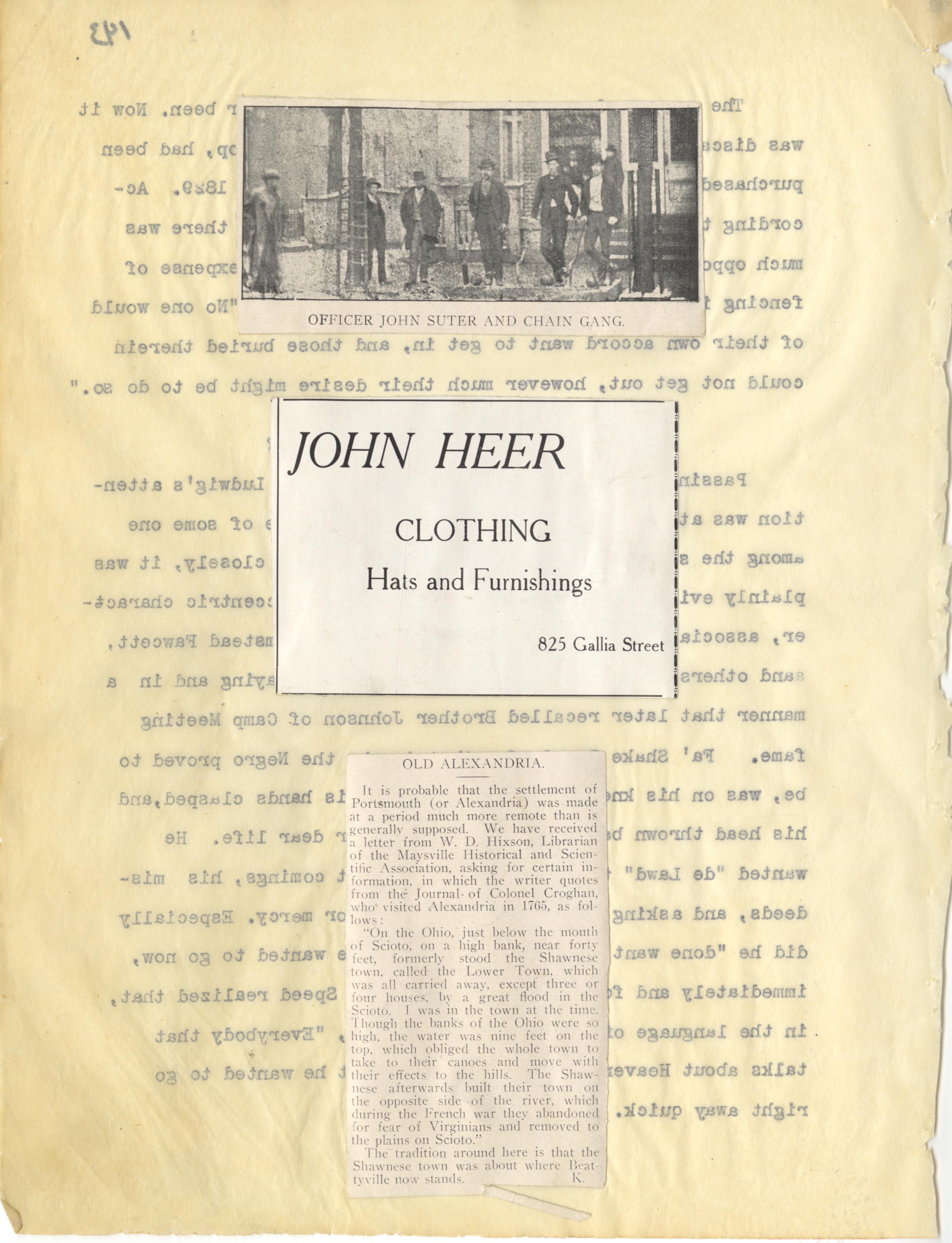 - Photo image of scanned scrapbook page. Pictured: Officer John Suter and the Chain Gang; Ad for John Heer Clothing, Hats, and Furnishings at 825 Gallia Street; Article in the Portsmouth Times about Old Alexandria