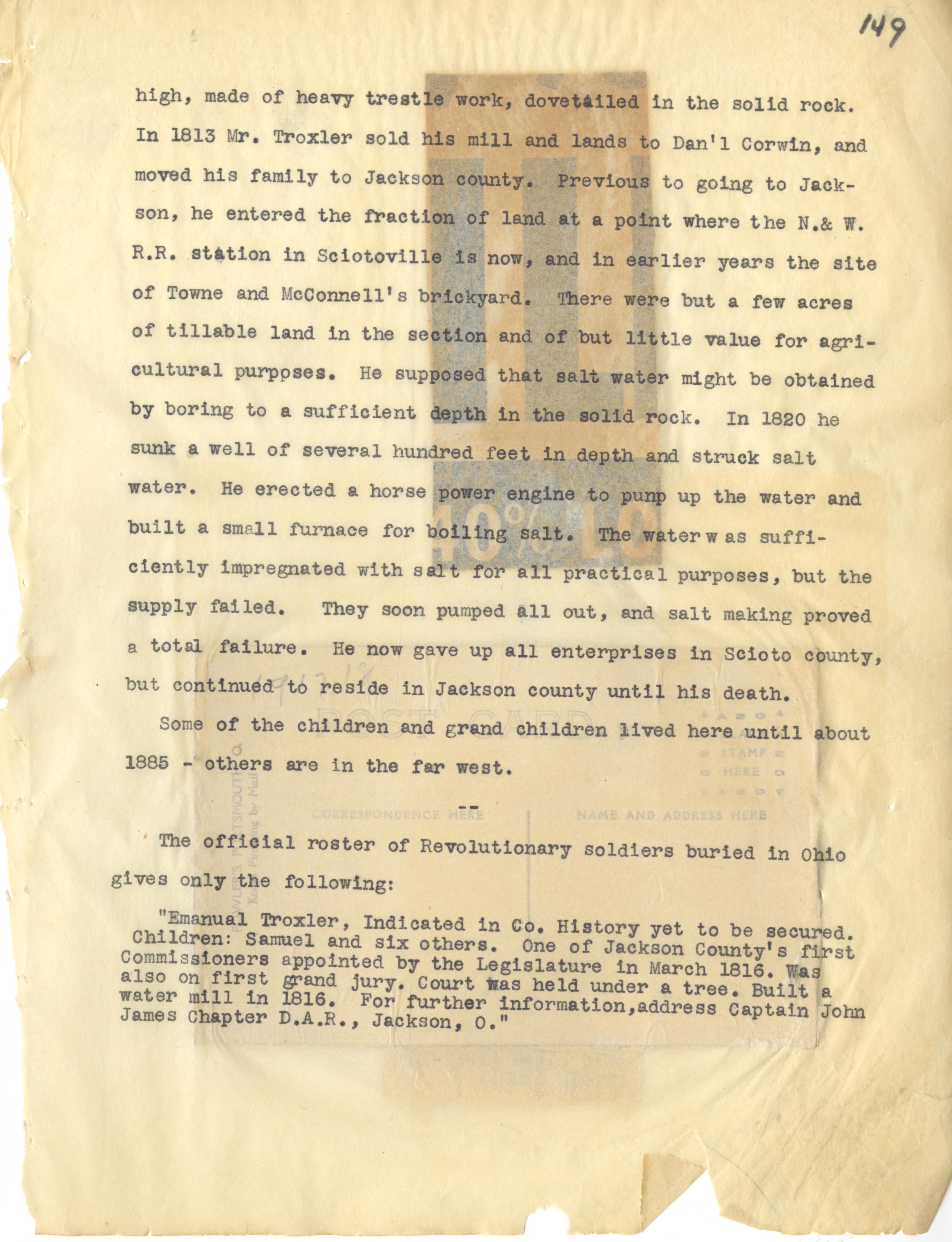- Photo image of scanned scrapbook page. Pictured: Continuation of Emanuel Troxler and his entry in the Official Roster of Revolutionary Soldiers Buried in Ohio. Daniel Corwin; N & W station in Sciotoville; Towne & McConnell's Brickyard