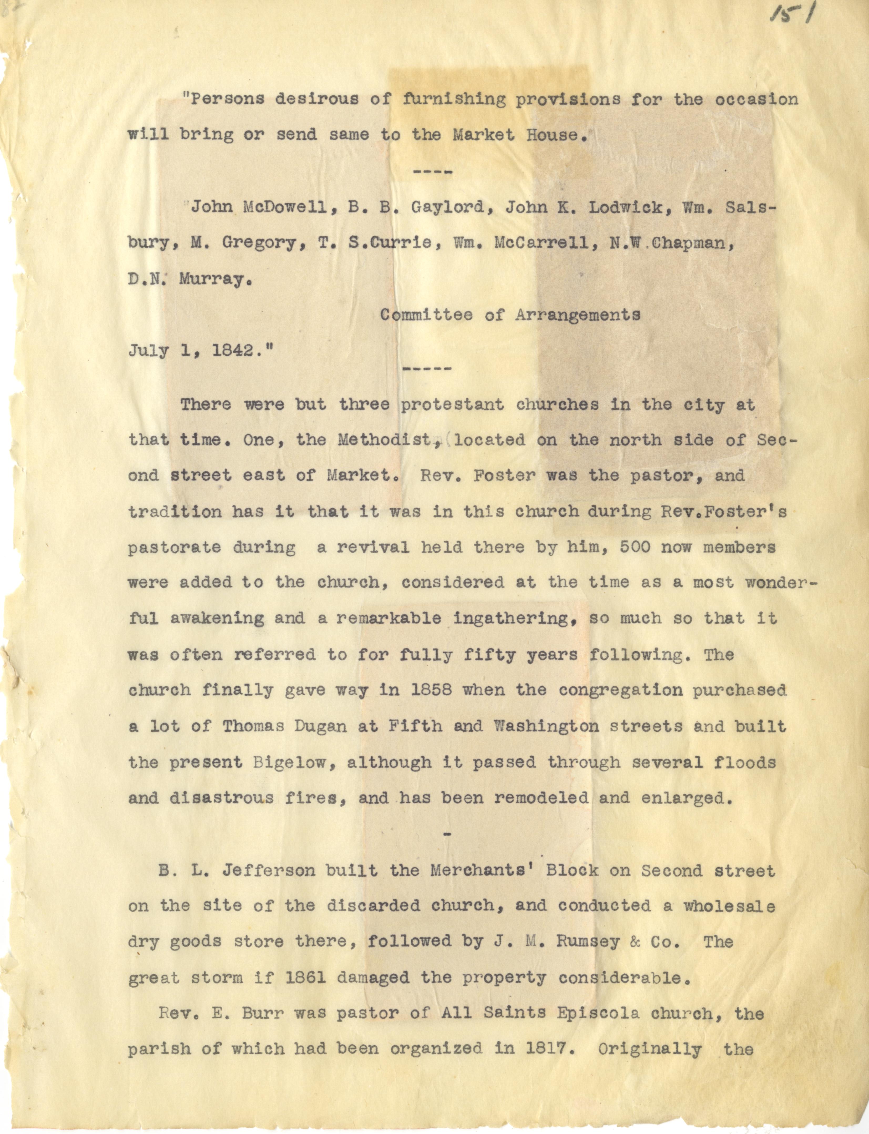- Photo image of scanned scrapbook page. Pictured:typed page giving information about the history of Protestant Churches in Portsmouth on July 1, 1842. Market House; John McDowell; B. B. Gaylord; John K. Lodwick; William Salsbury; M. Gregory; T. S. Currie; Wm. McCarrell; N. W. Chapman; D. N. Murray; Methodist Church on corner of Second (2nd) and Market Streets; Reverend Foster; Thomas Dugan; B. L. Jefferson; Merchants' Block; Bigelow; J. M. Rumsey & Co.; Rev. E. Burr; All Saints Church