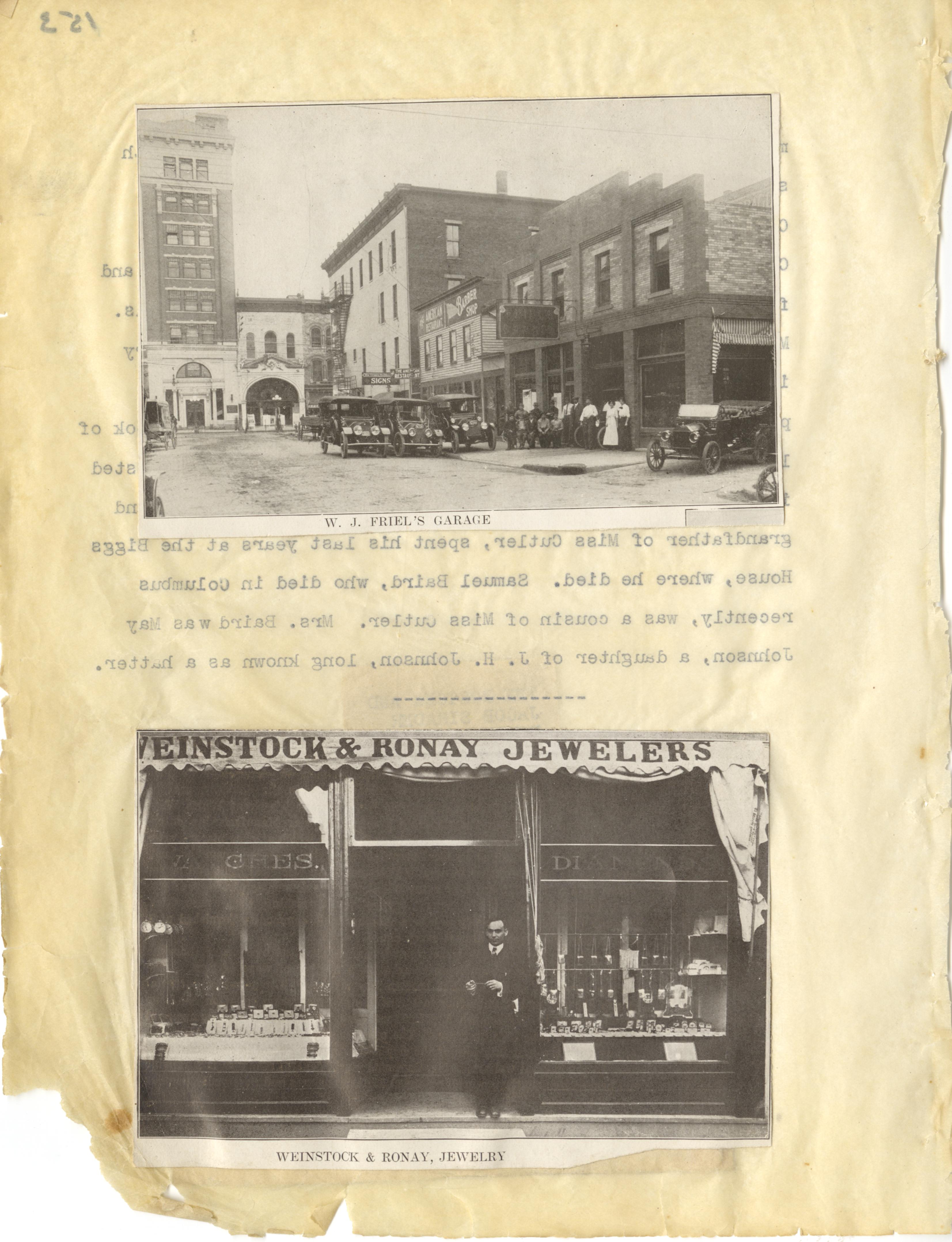 - Photo image of scanned scrapbook page. Pictured: W. J. Friel's Garage at 14-16 West Fifth (5th) Street; Weinstock & Ronay Jewelry