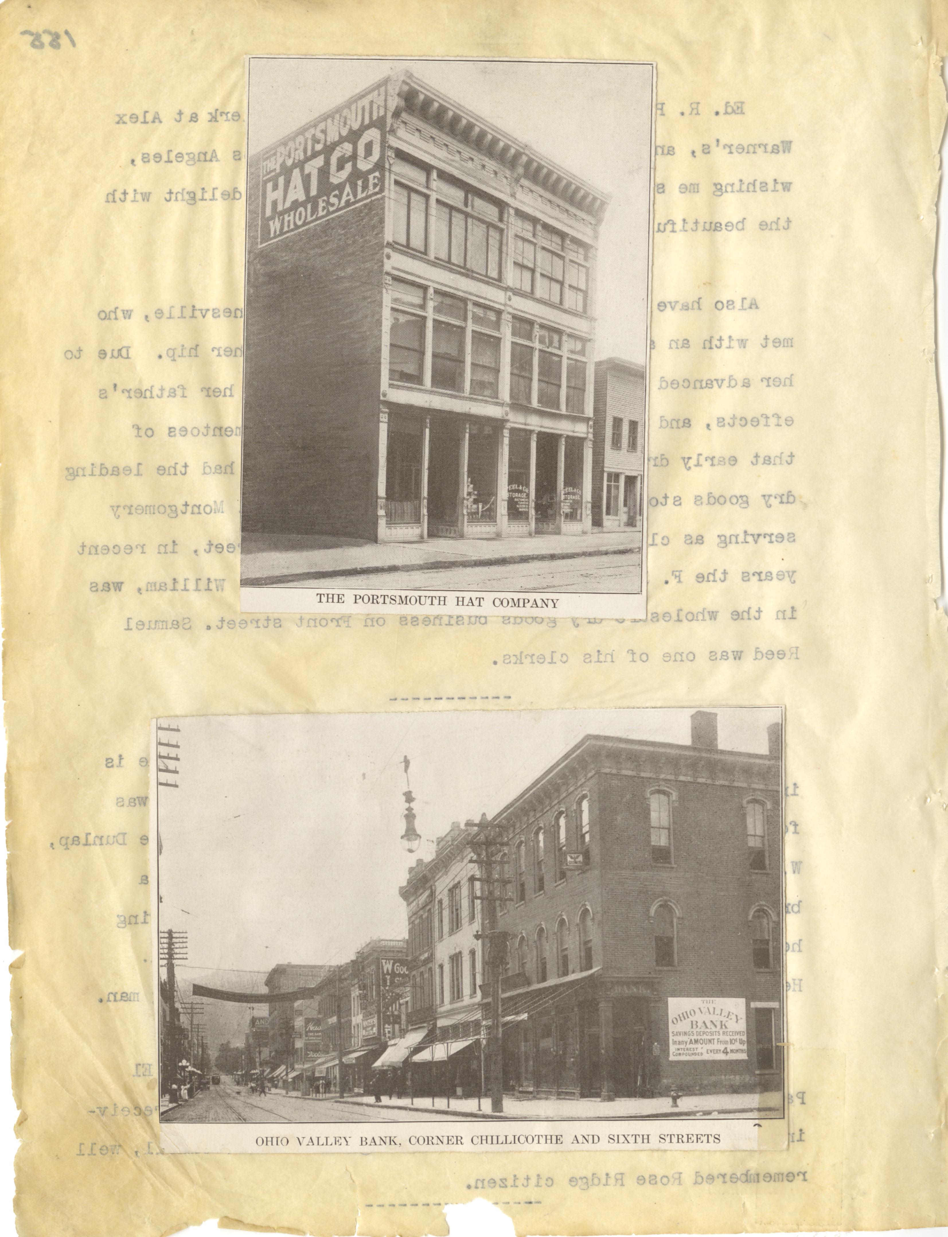 - Photo image of scanned scrapbook page. Pictured: The Portsmouth Hat company; the Ohio Valley Bank on the corner of Chillicothe and Sixth (6th) Streets