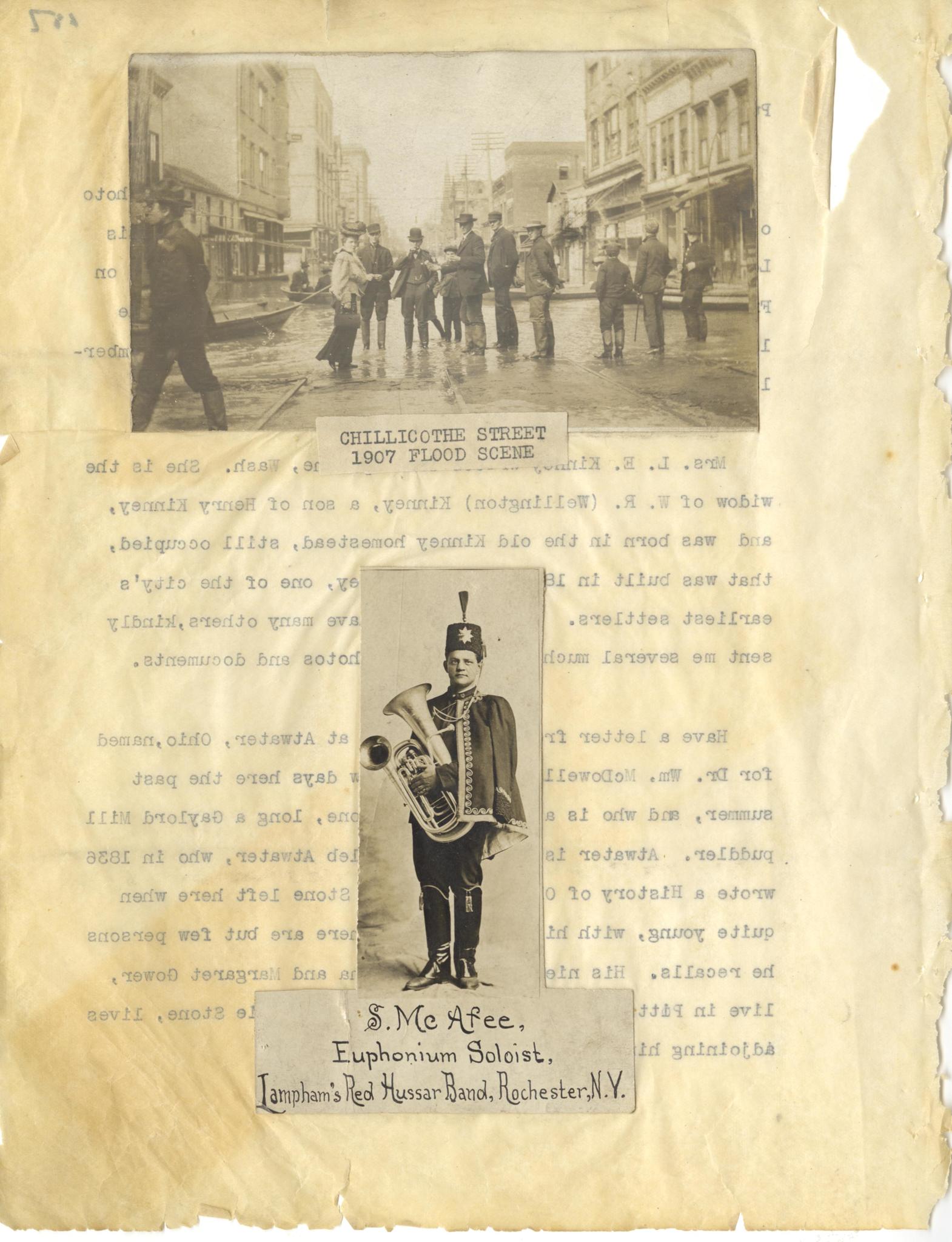 - Photo image of scanned scrapbook page. Pictured: Chillicothe Street, 1907 Flood Scene; C. McAfee, Euphonium Soloist, Lampham's Red Hussar Band, Rochester, New York