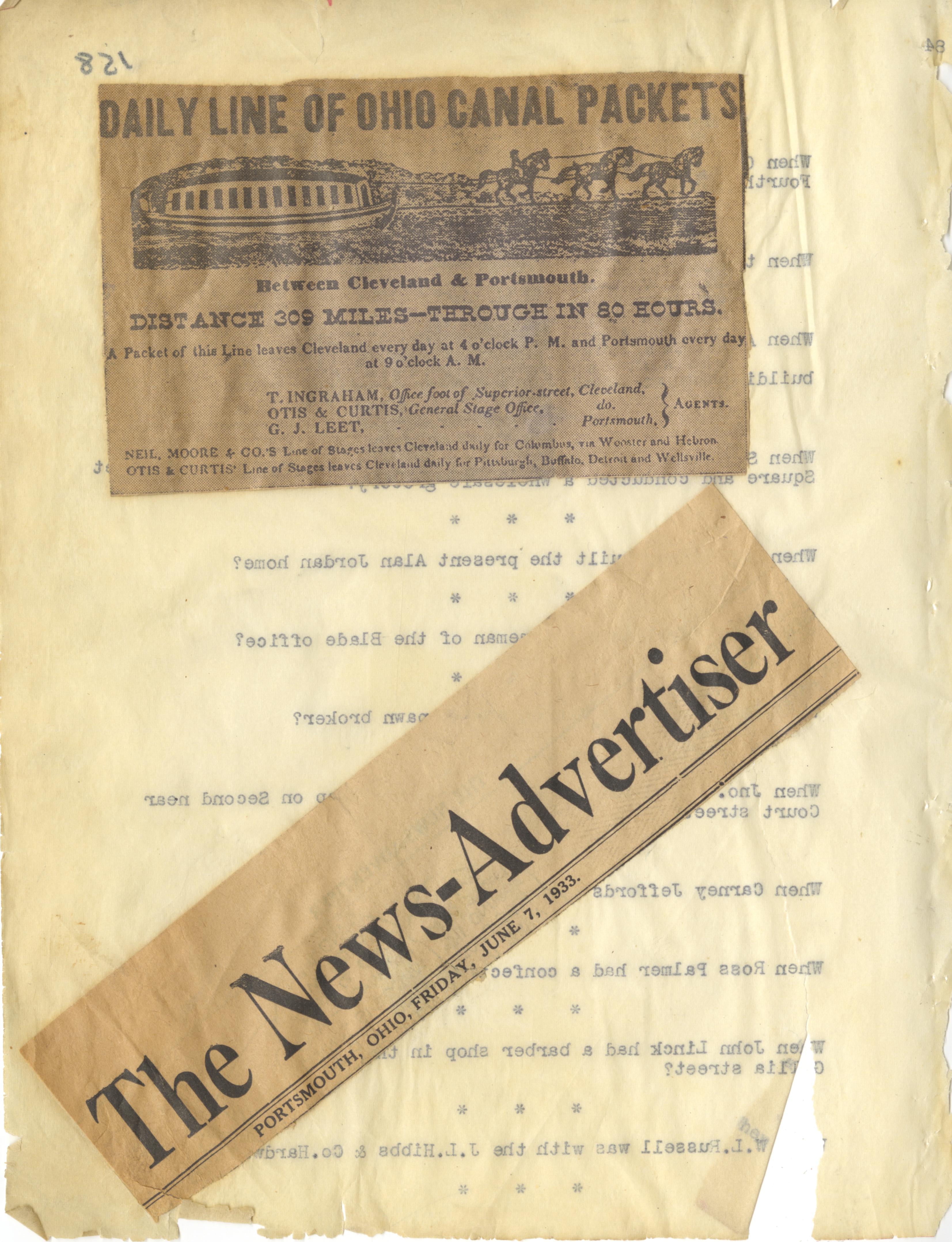 - Photo mage of scanned scrapbook page. Pictured: The News-Advertiser, headline for the Portsmouth Times, from June 7, 1933; Ad for the Dayline of Ohio Canal Packets from between Cleveland and Portsmouth
