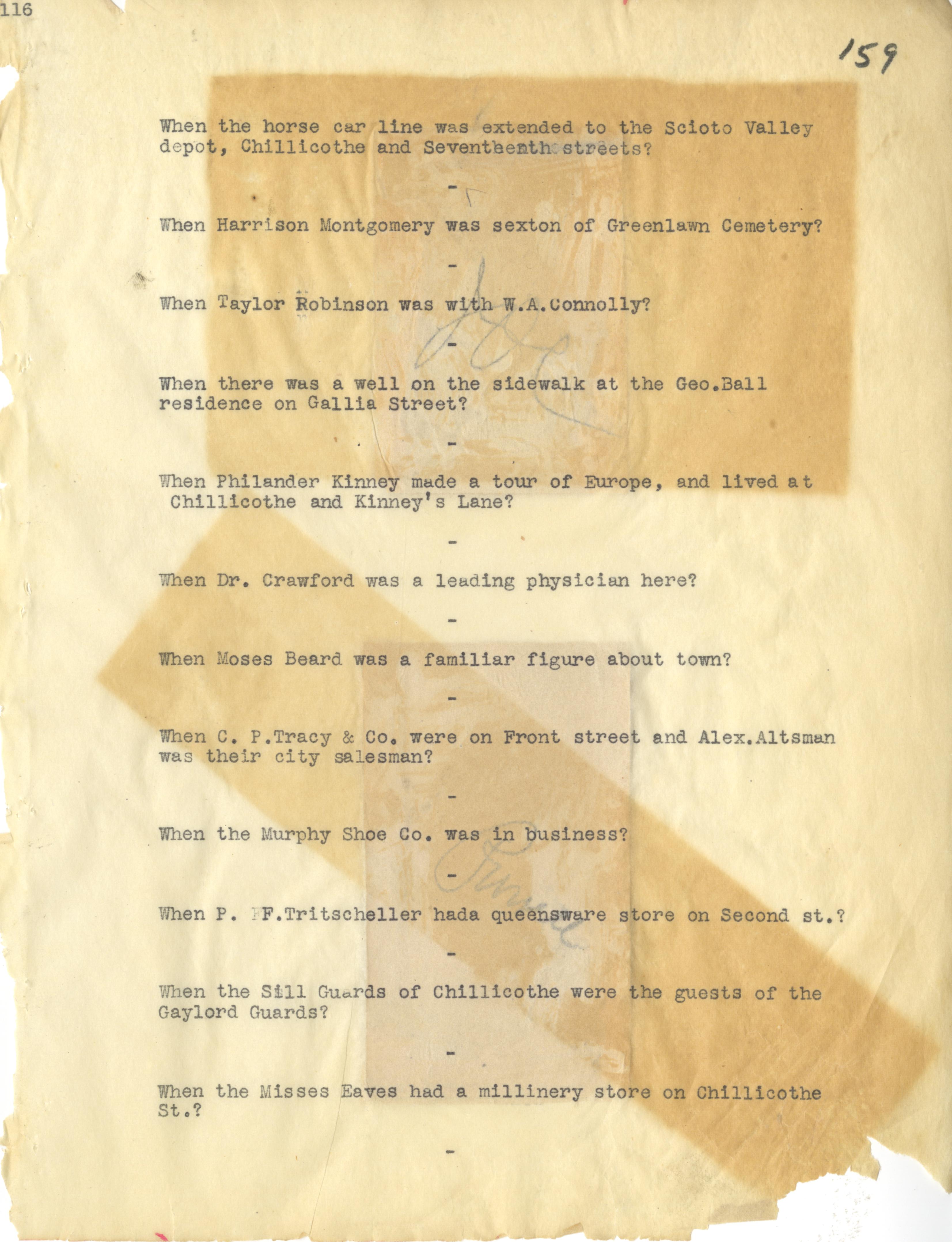 - Photo image of scanned scrapbook page. Pictured: typed page with the continuation of Do You Remember. Horse car line to the Scioto Valley Depot; Harrison Montgomery, sexton of Greenlawn Cemetery; Taylor Robinson; W. A. Connolly; George Ball; Philander Kinney; Kinney's Lane; Dr. Crawford; Moses Beard; C. P. Tracy & Co.; Alex Altsman; Murphy Shoe Co.; Sill Guards; Gaylord Guards; Misses Eaves