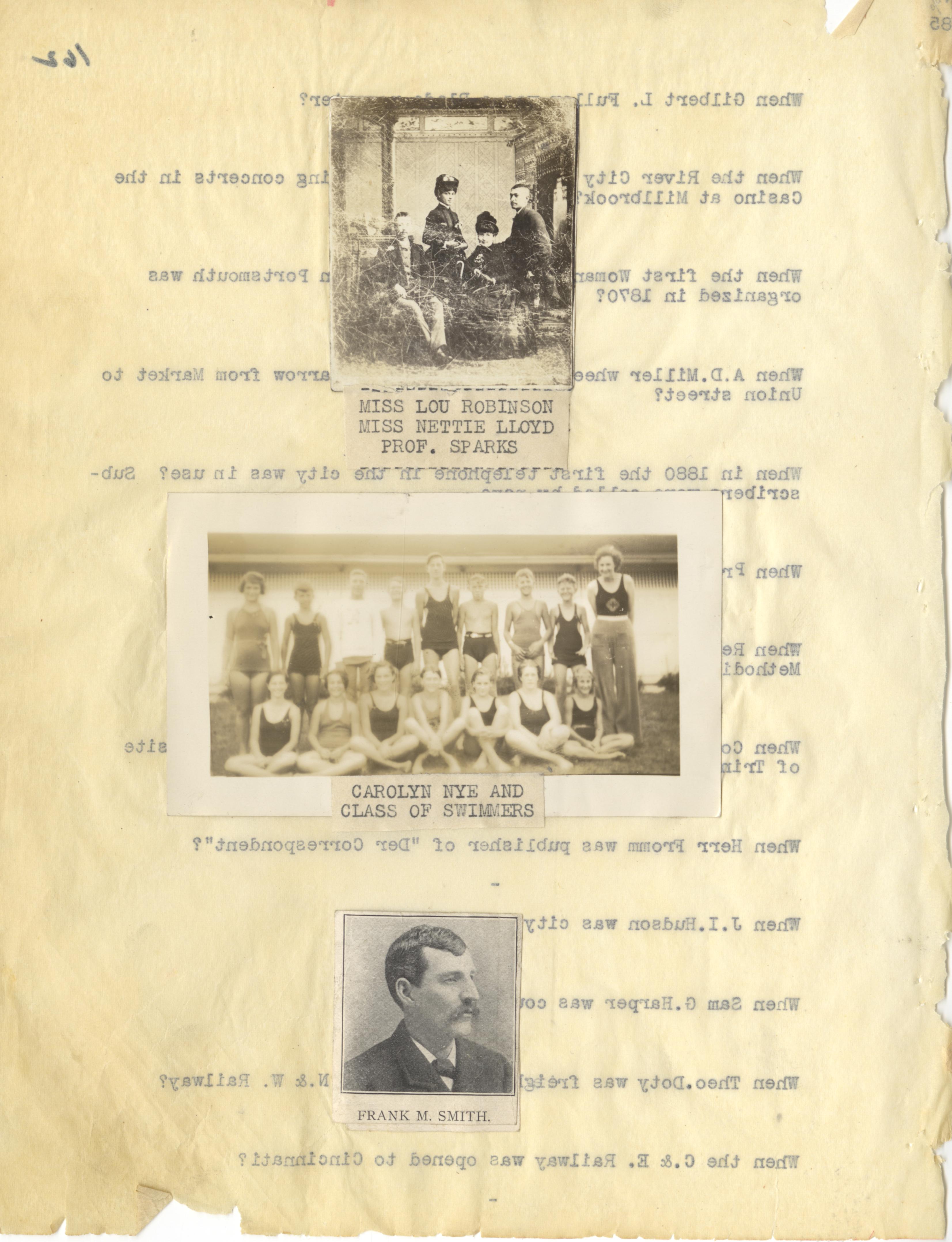 - Photo image of scanned scrapbook page. Pictured: Miss Lou Robinson, Miss Nettie Lloyd, and Prof. Sparks; Carolyn Nye and Class of Swimmers; Frank M. Smith