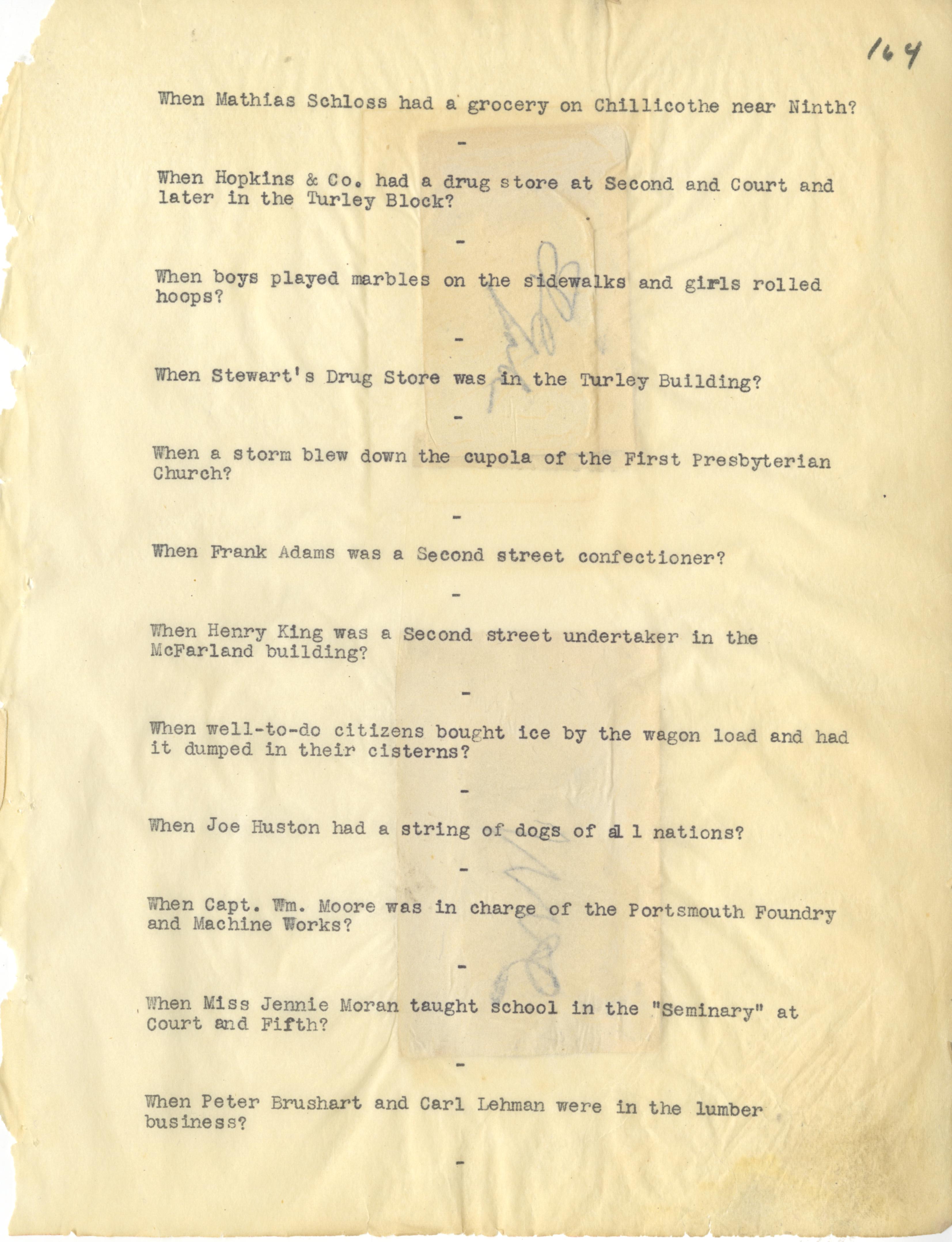 - Photo image of scanned scrapbook page. Pictured: typed questions from Do You Remember Continued. Mathias Schloss' grocery store; Hopkins & Co. on Second (2nd) Street, later in the Turley Building; Stewart's Drug Store; First Presbyterian Church; Frank Adams; Heny King, undertaker in the McFarland building; Joe Huston's dogs of all nations; Capt. William Moore and the Portsmouth Foundry and Machine Works; Jennie Moran, taught Seminary School at Court and Fifth (5th); Peter Brushar; Carl Lehman
