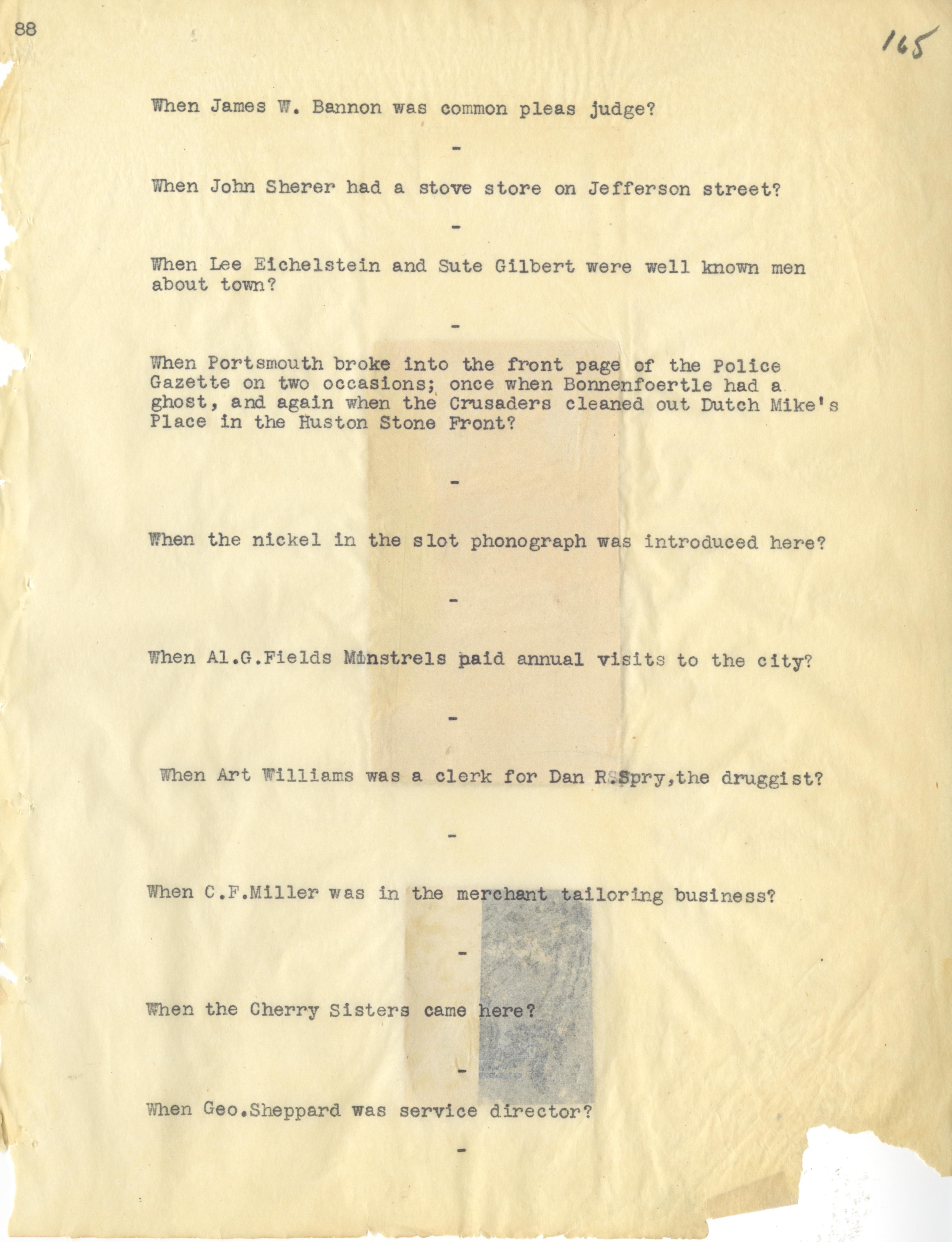 - Photo image of scanned scrapbook page. Pictured: typed page with questions from Do You Remember Continued. James W. Bannon; John Sherer; Lee Eichelstein; Sute Gilbert; Portsmouth makes it to front page of the Police Gazette twice: Bonnonfoertle's ghost; Crusaders cleaned out Dutch Mike's Place in the Huston Stone Front; Al G. Fields Minstrels; Art Williams, cler for Dan Spry, the druggist; C. F. Miller; Cherry sisters; George Sheppard