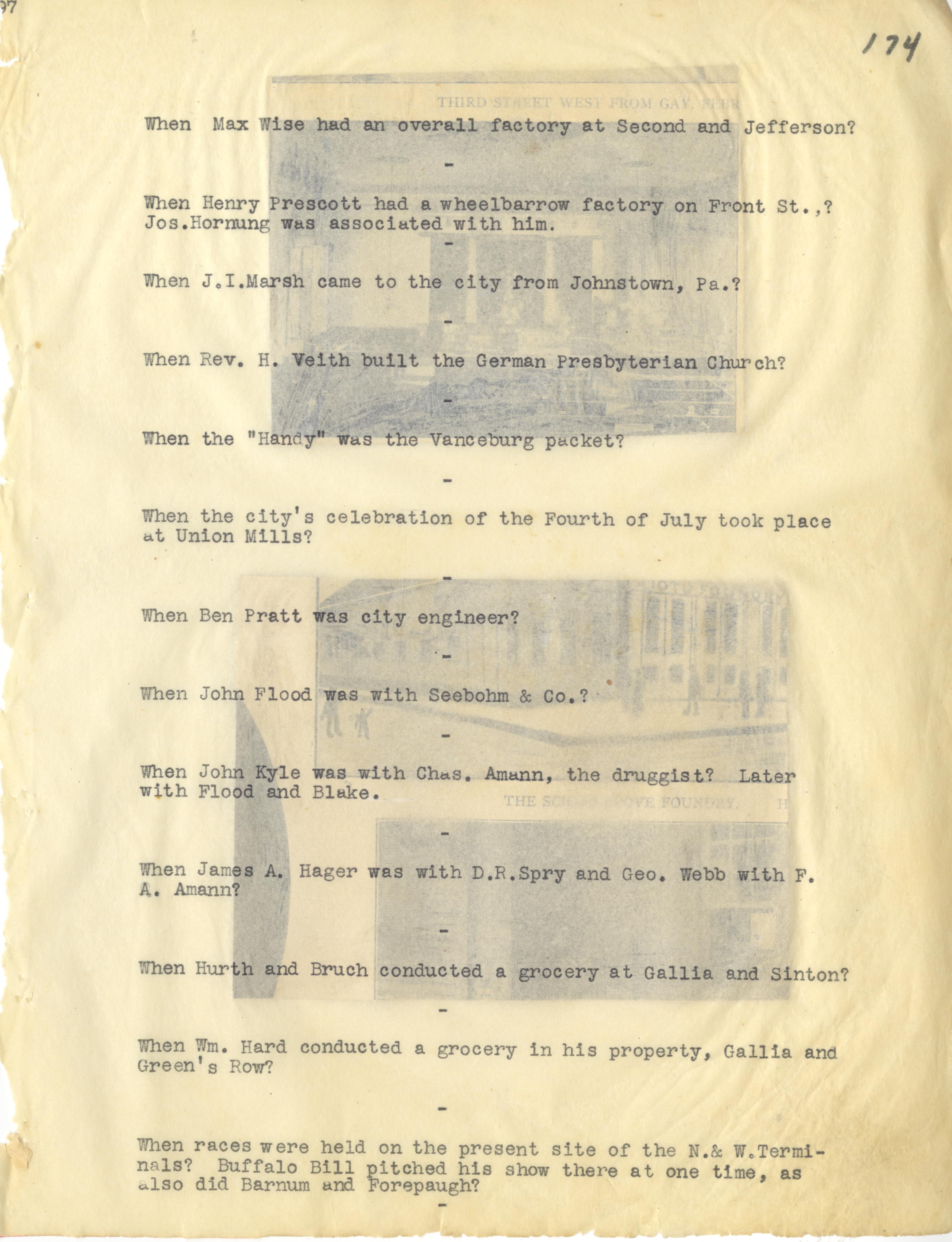 - Photo image of scanned scrapbook page. Pictured: typed page from Do You Remember Continued. Max Wise's overall factory at Second (2nd) and Jefferson; Henry Prescott had a wheelbarrow factory on Front Street, associate Joseph Hornung; J. I. Marsh; Fourth of July Celebration at Union Mills; Rev. H. Veith built the German Presbyterian Church; Ben Pratt, only city engineer; John Flood was with Seebohm & Co.; John Kyle was with Charles Amann, druggist, later with Flood and Blake; James A. Hager was with D. R. Spry and George Webb with F. A. Amann; Hurth and Bruch grocery; William Hard; Buffalo Bill's show; N & W Terminals