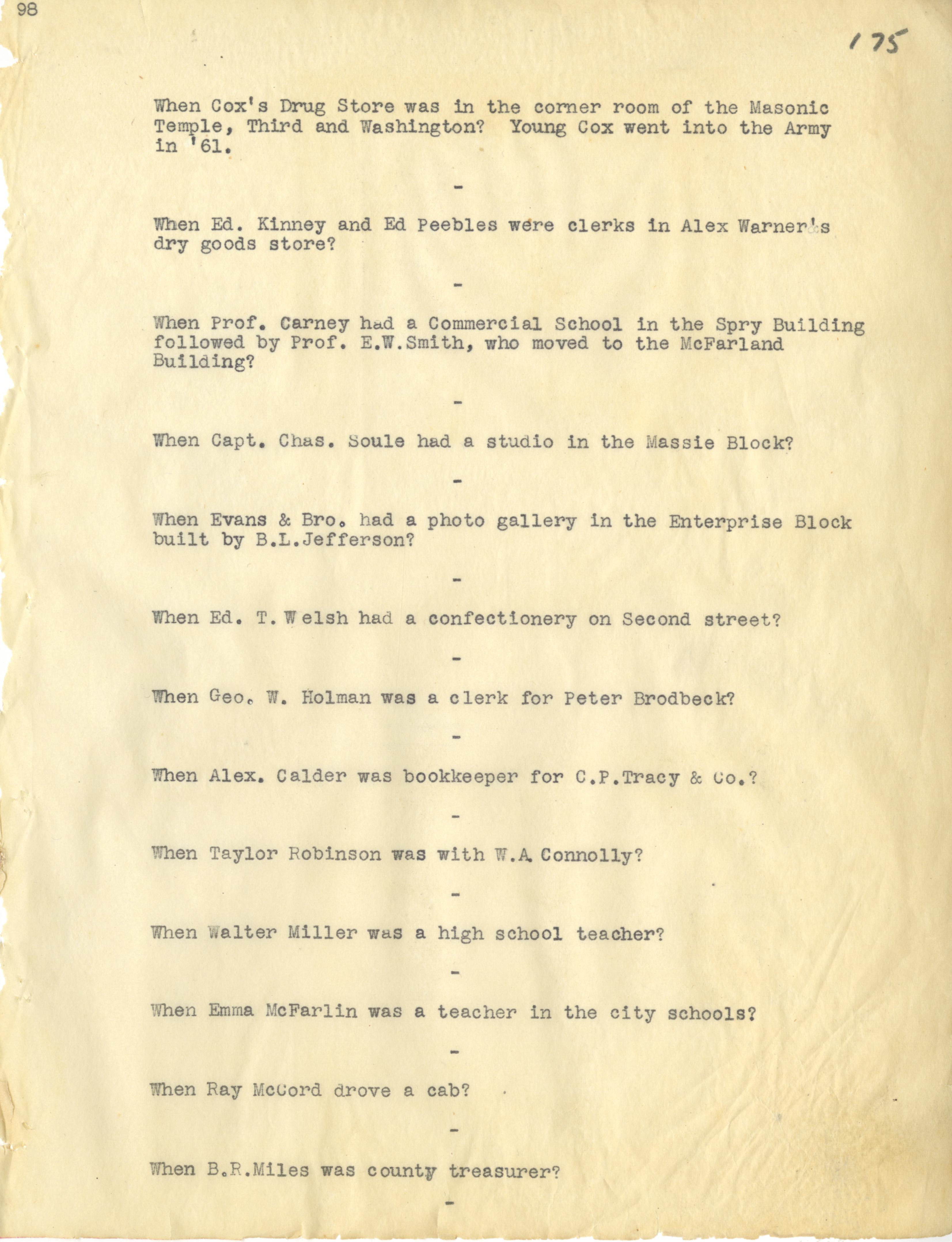 - Photo image of scanned scrapbook page 175. Pictured: typed page from Do You Remember Continued. Cox's Drug Store, corner of the Masonic Temple; Edward Kinney and Ed Peebles, clerks in Alex Warner's dry goods store; Prof. Carney had a commercial school in the Spry Building followed by Prof. E. W. Smith who moved to the McFarland Building; Capt. Charles Soule's studio in the Massie Block; Evans & Bro. photo gallery in the Enterprise Block built by B. L. Jefferson; Edward T. Welsh; George Holman was a clerk for Peter Brodbeck; Alex Calder was a bookkeeper for C. P. Tracy & Co.; Taylor Robinson was with W. A. Connolly; Walter Miller; Emma McFarlin; Ray McCord; B. R. Miles