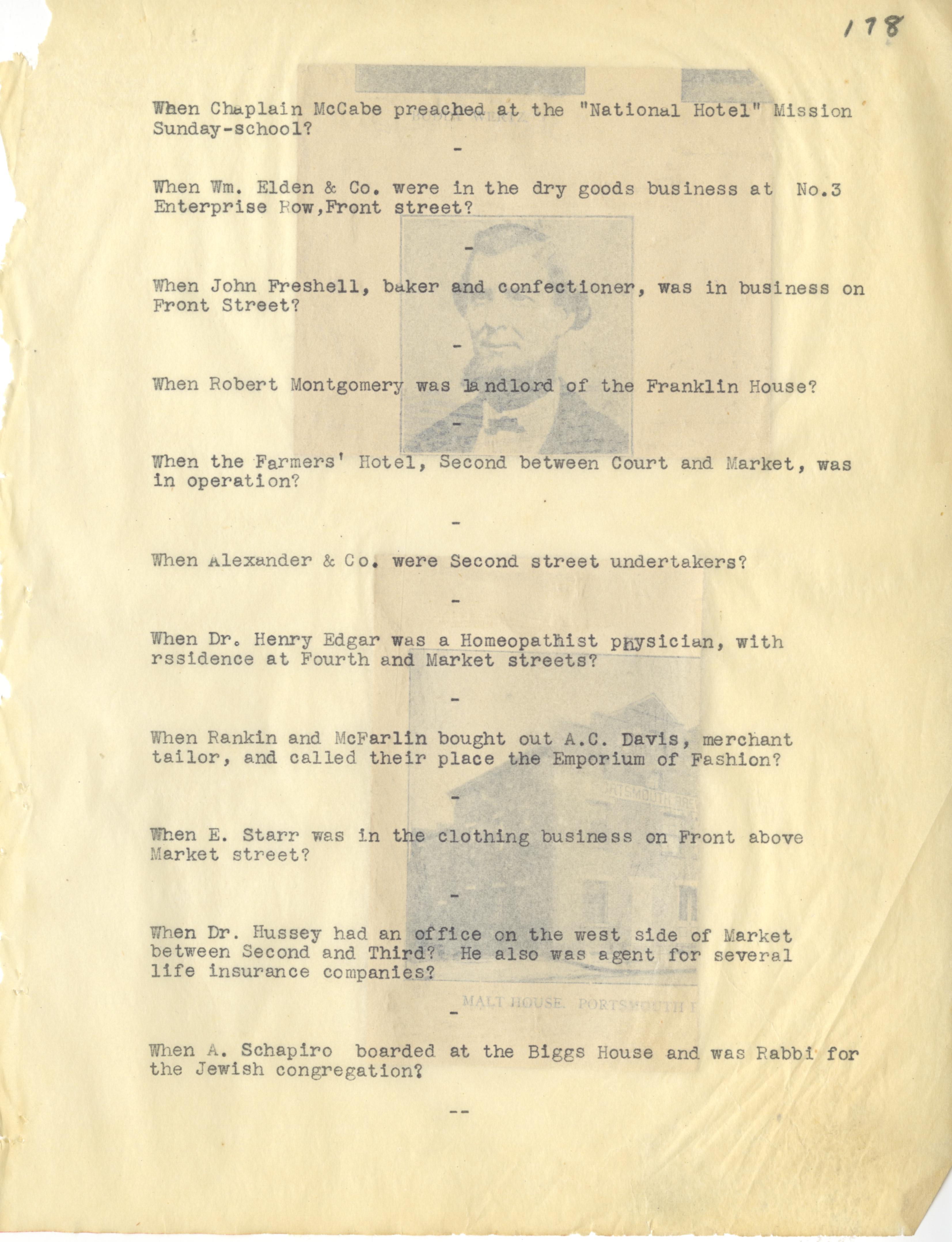 - Photo image of scanned scrapbook page 178. Pictured: typed page from Do You Remember Continued. Chaplain McCabe preached at the National Hotel, Mission Sunday School; William Elden & Co.; John Freshell; Robert Montgomery, landlord of the Franklin House; Farmers' Hotel' Alexander & Co.; Dr. Henry Edgar was a Homeopathic physician; Rankin and McFarlin bought out A. C. Davis and called their place Emporium Fashion; E. Starr; Dr. Hussey; A. Schapiro, Rabi for the Jewish congregation who boarded at the Biggs House