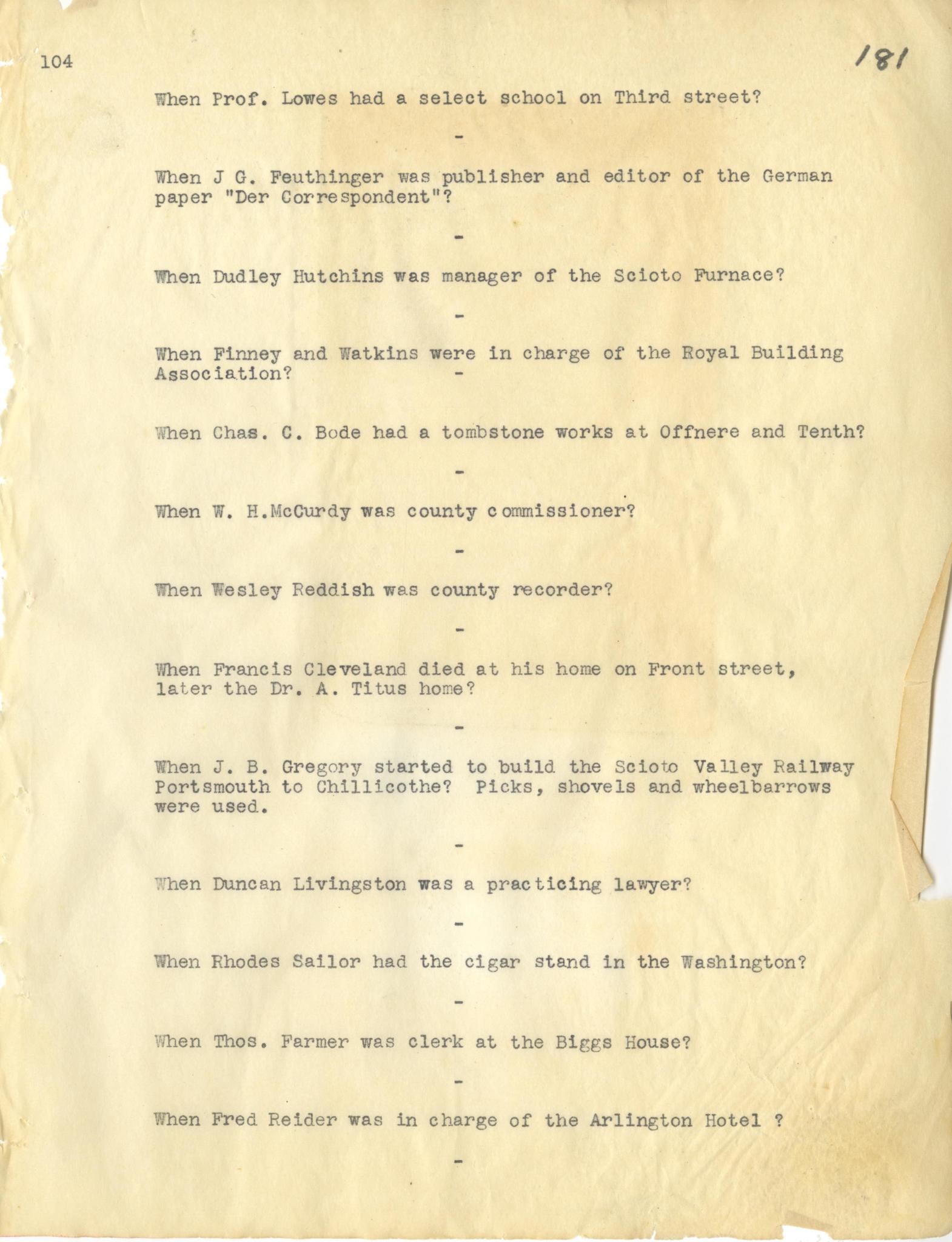 - Photo image of scanned scrapbook page 181. Pictured: typed page from Do You Remember Continued. Prof. Lowes; J. G. Feuthinger, editor of the Der Correspondent; Dudley Hutchins, manager of the Scioto Furnace; Finney and Watkins were in charge of the Royal Building Association; Charles C. Bode; W. H. McCurdy; Wesley Reddish; Francis Cleveland; Dr. A. Titus; J. B. Gregory; Valley Railway; Duncan Livingston; Rhodes Sailor; Thomas Farmer, clerk at the Biggs House; Fred Reider; Arlington Hotel