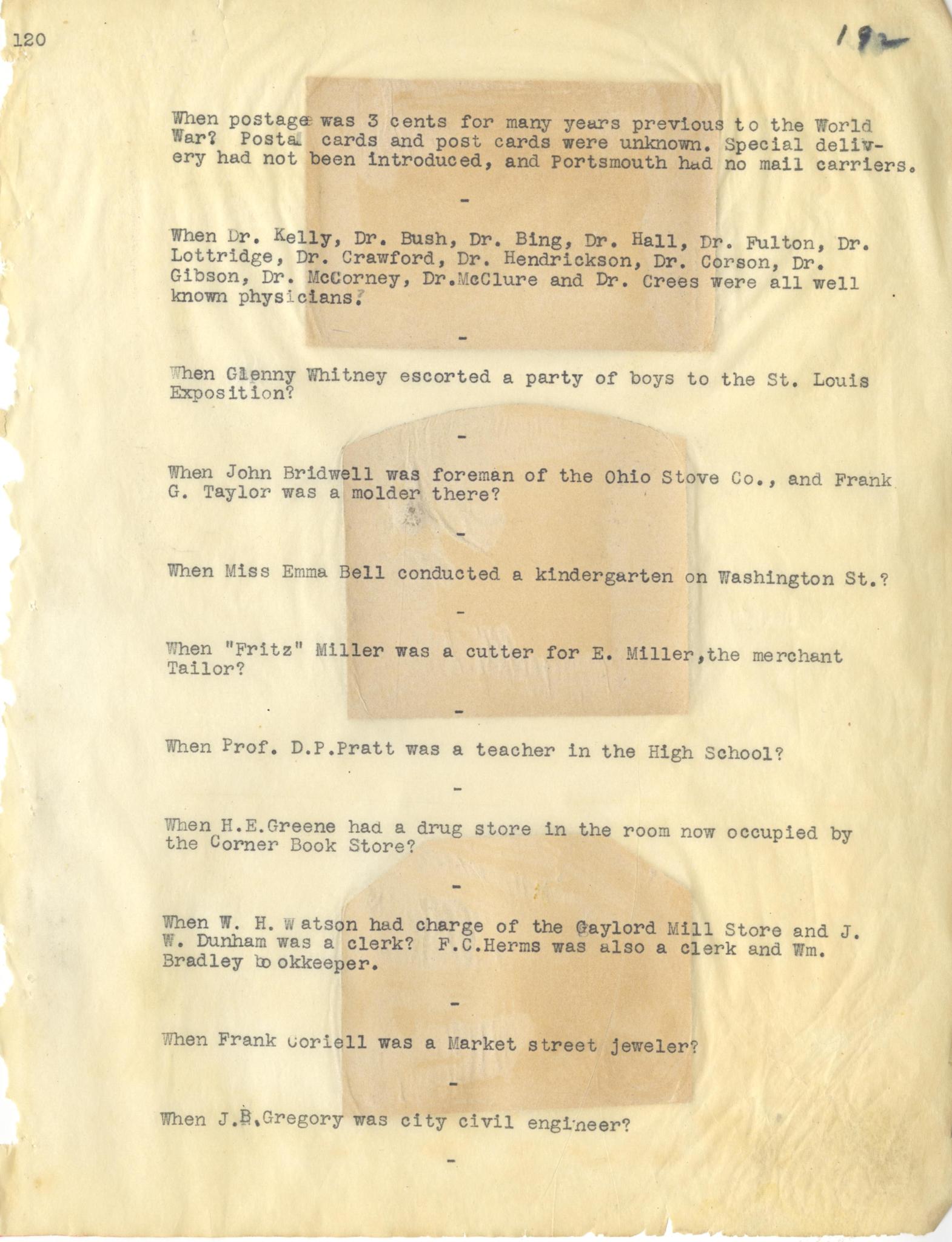 - Photo image of scanned scrapbook page 192. Pictured: typed page from Do You Remember Continued. Postage 3 cents; World War; Dr. Kelly; Dr. Bush; Dr. Bing; Dr. Hall; Dr. Fulton; Dr. Lottridge; Dr. Crawford; Dr. Hendrickson; Dr. Corson; Dr. gibson; Dr. McCorney; Dr. McClure; Dr. Creese; Glenny Whitney; John Bridwell; Ohio Stove Company; Frank G. Taylor; Emma Bell; "Fritz" Miller; E. Miller; Prof. D. P. Pratt; H. E. Greene; Corner Book Store; W. H. Watson; Gaylord Mill Store; J. W. Dunham; F. C. Herms; William Bradley; Frank Coriell; J. B. Gregory