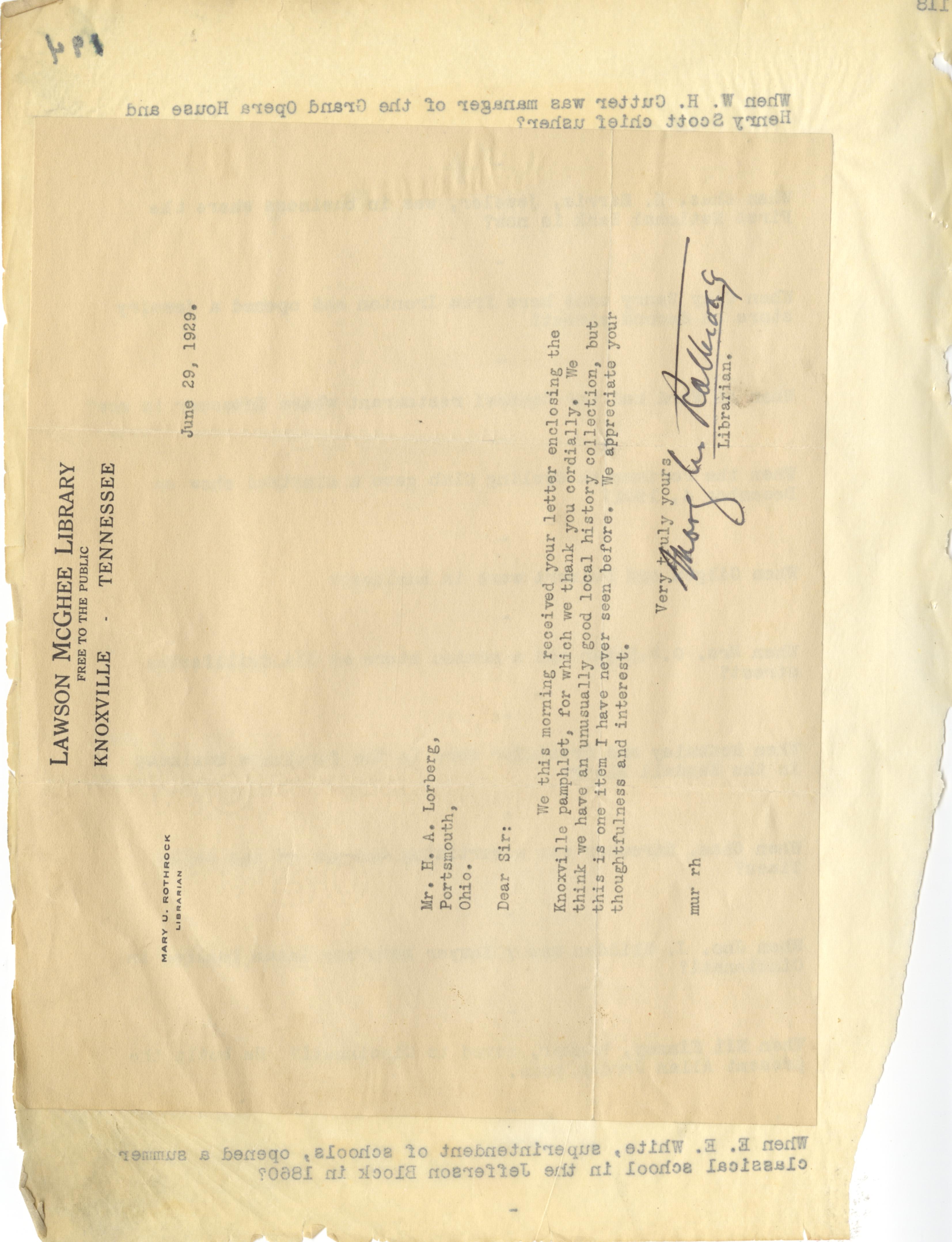 Henry A. Lorberg, “Lawson McGhee Library (1929); Mary U. Rothrock; H.A. Lorberg,” Scioto County Public Library Local History Digital Collection, accessed December 18, 2025, https://www.sciotolibrary.org/history/items/show/23110.