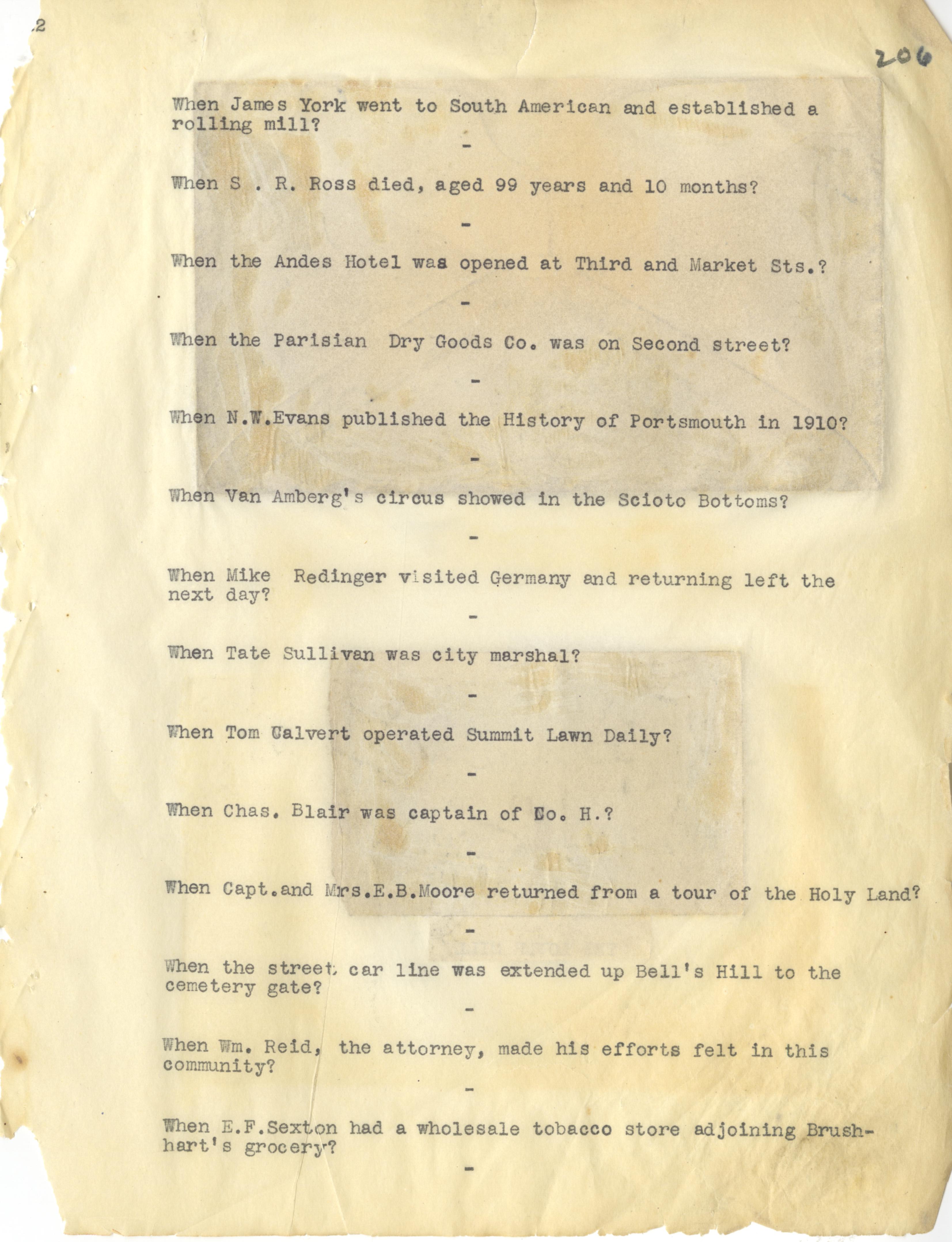 - Photo image of scanned scrapbook page. Pictured: typed page from Do You Remember When Continued. James York; S. R. Ross; Andes Hotel; Parisian Dry Goods on Second (2nd) Street; N. W. Evans published the History of Portsmouth in 1910; Van Amberg's Circus showed in the Scioto Bottoms; Mike Redinger; Tate Sullivan; Tom Calvert; Charles Blair; Capt. and Mrs. E. B. Moore; Street Car line up to Bell's Hill; William Reid; E. F. Sexton; Brushart's Grocery