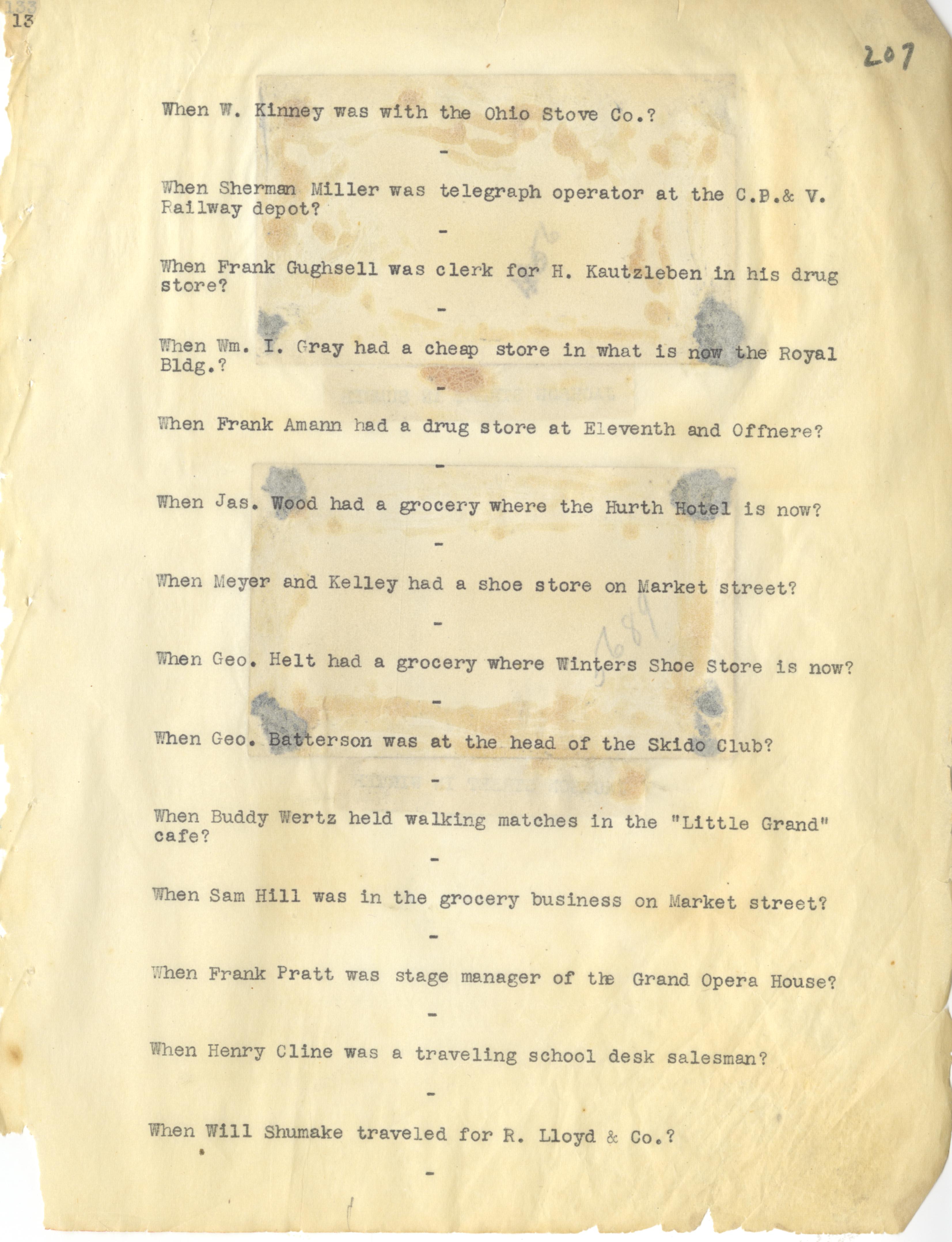 - Photo image of scanned scrapbook page. Pictured: typef page from Do You Remember Continued. W. Kinney with the Ohio Stove Company; Sherman Miller, telegraph operator at the C. P. & V. Railway Depot; Frank Gughsell, clerk for H. Kautzleben; Wm. I. Gray; Royal Building; Frank Amann; James wood; Hurth Hotel; Meyer and Kelley; George Helt; Winters Shoe Store; George Batterson; Buddy Wertz; Sam Hill; Frank Pratt, manager at the Grand Opera House; Henry Cline; Will Shumake traveled for R. Lloyd & Co.