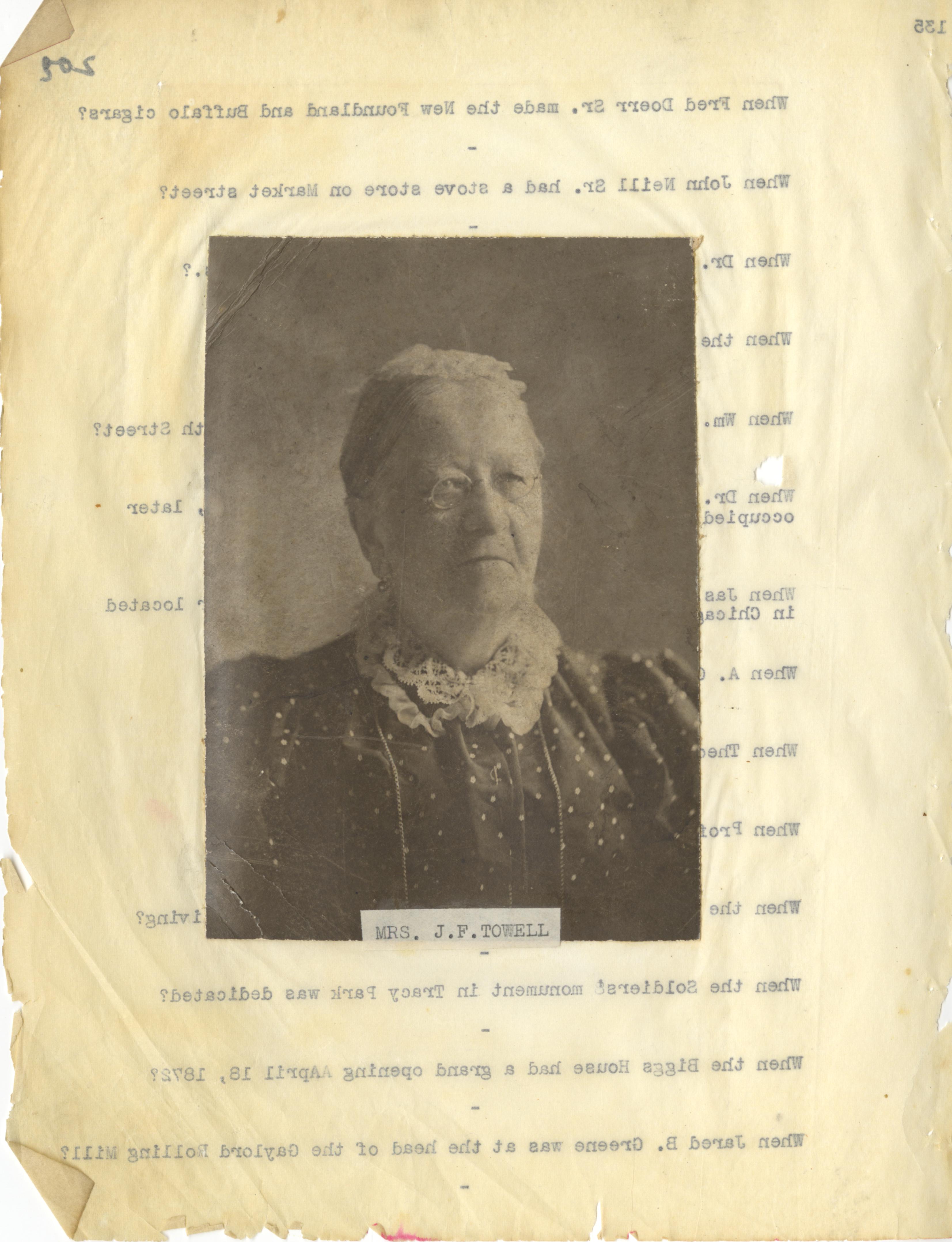 - Photo image of scanned scrapbook page. Pictured: black and white photo of Mrs. J. F. Towell
