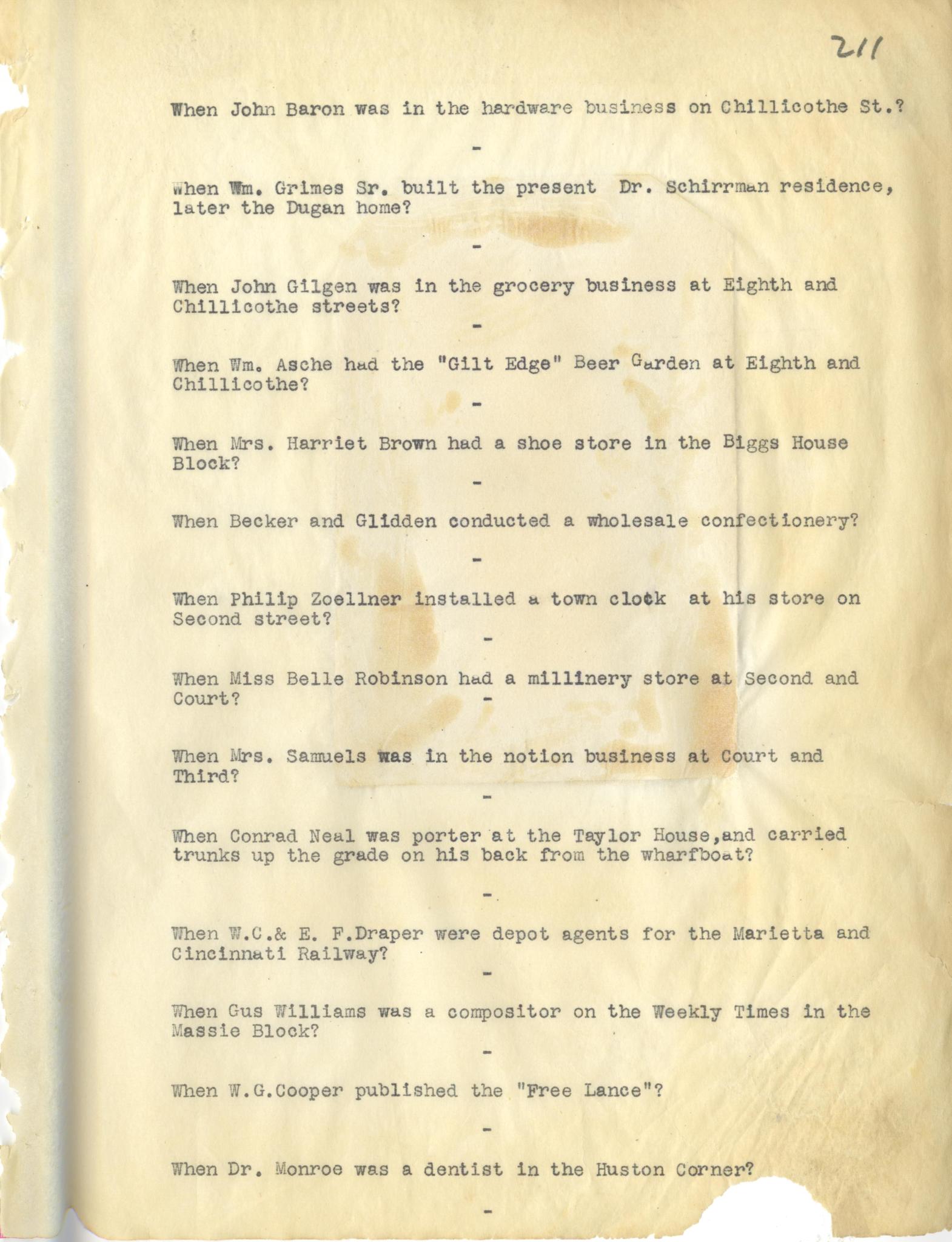 - Photo image of scanned scrapbook page. Pictured: typed page from Do You Remember Continued. John Baron; William Grimes Sr.; Dr. Schirrman; Dugan home; John Gilgen; William Asche; Beer Garden at Eighth (8th) and Chillicothe; Harriet Brown; Biggs House Block; Becker and Glidden; Phillip Zoellner; Belle Robinson; Mrs. Samuels; Conrad Neal; Taylor House; W. C. &. E. F. Draper Gus Williams, compositor on the Weekly Times in Massie Block; W. G. Cooper published the Free Lance; Dr. Monroe, dentist in the Huston Corner