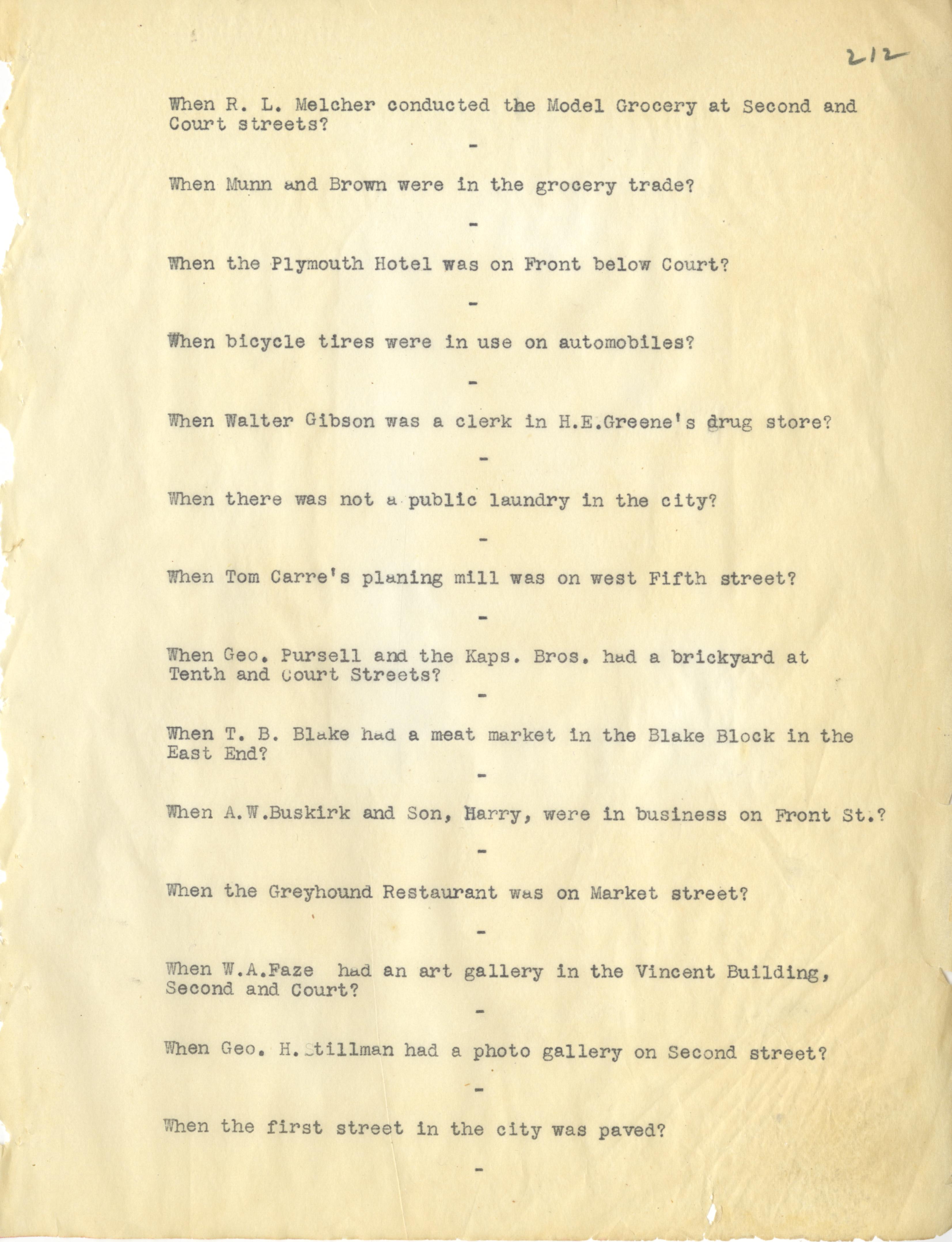 - Photo image of scanned scrapbook page. Pictured: typed page from Do You Remember Continued. R. L. Melcher; Munn and Brown in the grocery trade; Plymouth Hotel; Bicycle tires; Walter Gibson, clerk at H. E. Greene's drug store; no public laundry; Tom Carre's planing mill; George Pursell and the Kaps. Bros.; T. B. Blake meat market in Blake Block; A. W. Buskirk and son Harry; Greyhound Restaurant; W. A. Faze; Vincent Building; George A. Stillman; first paved street