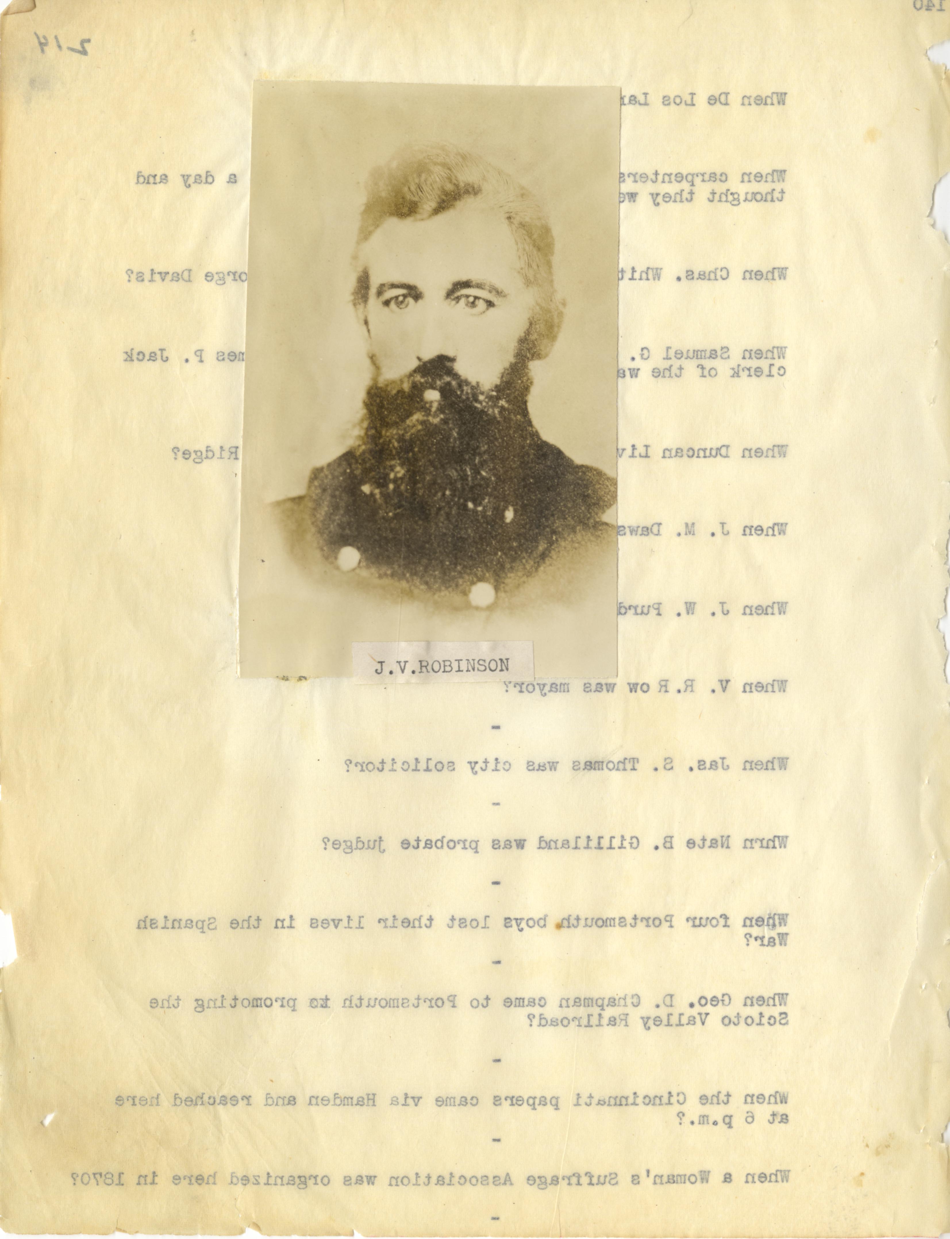 - Photo image of scanned scrapbook page. Pictured: black and white photo of J. V. Robinson