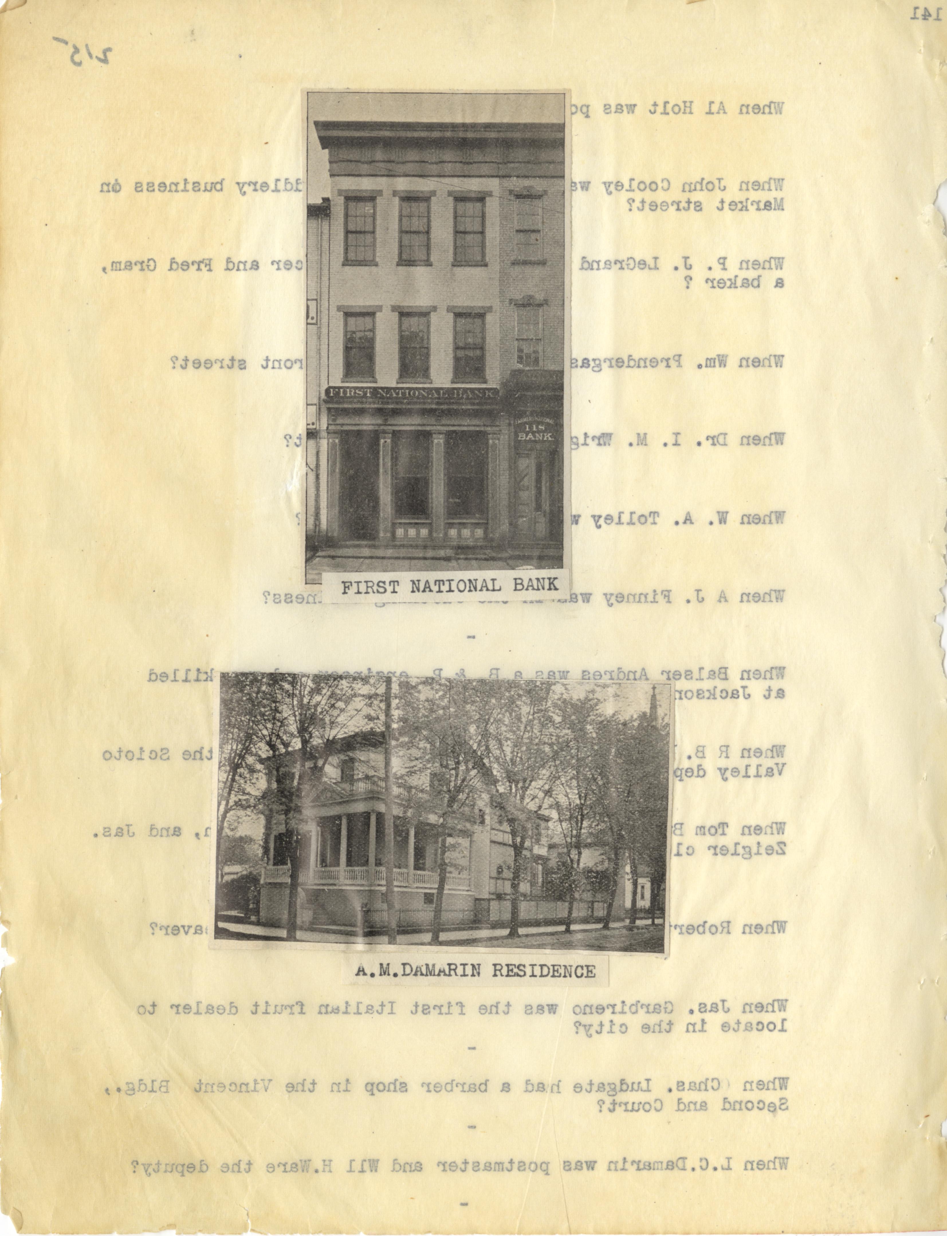 - Photo image of scanned scrapbook page. Pictured: two black and white photos of the First National Bank and the A. M. Damarin Residence