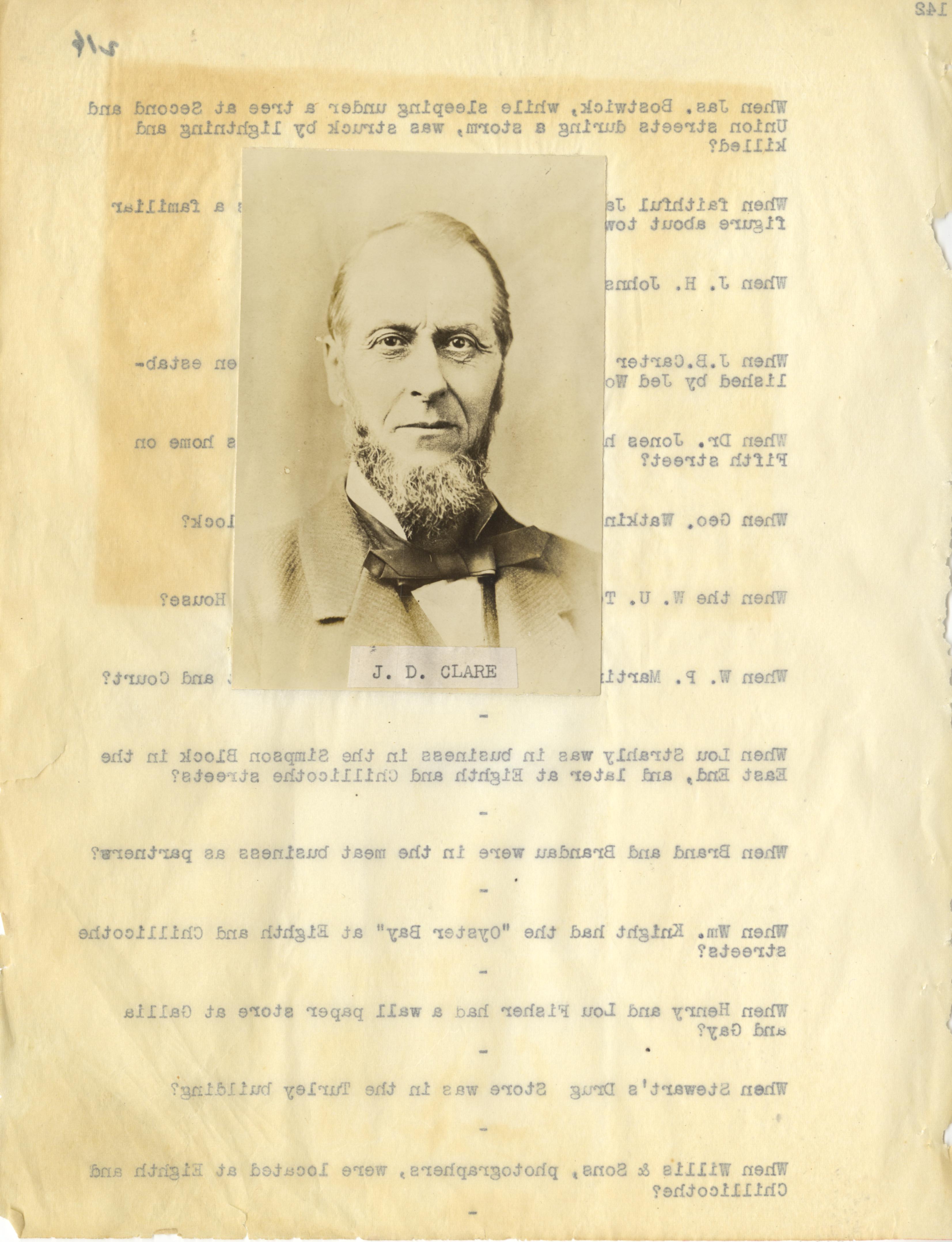 - Photo image of scanned scrapbook page. Pictured: black and white photograph of J. D. Clare