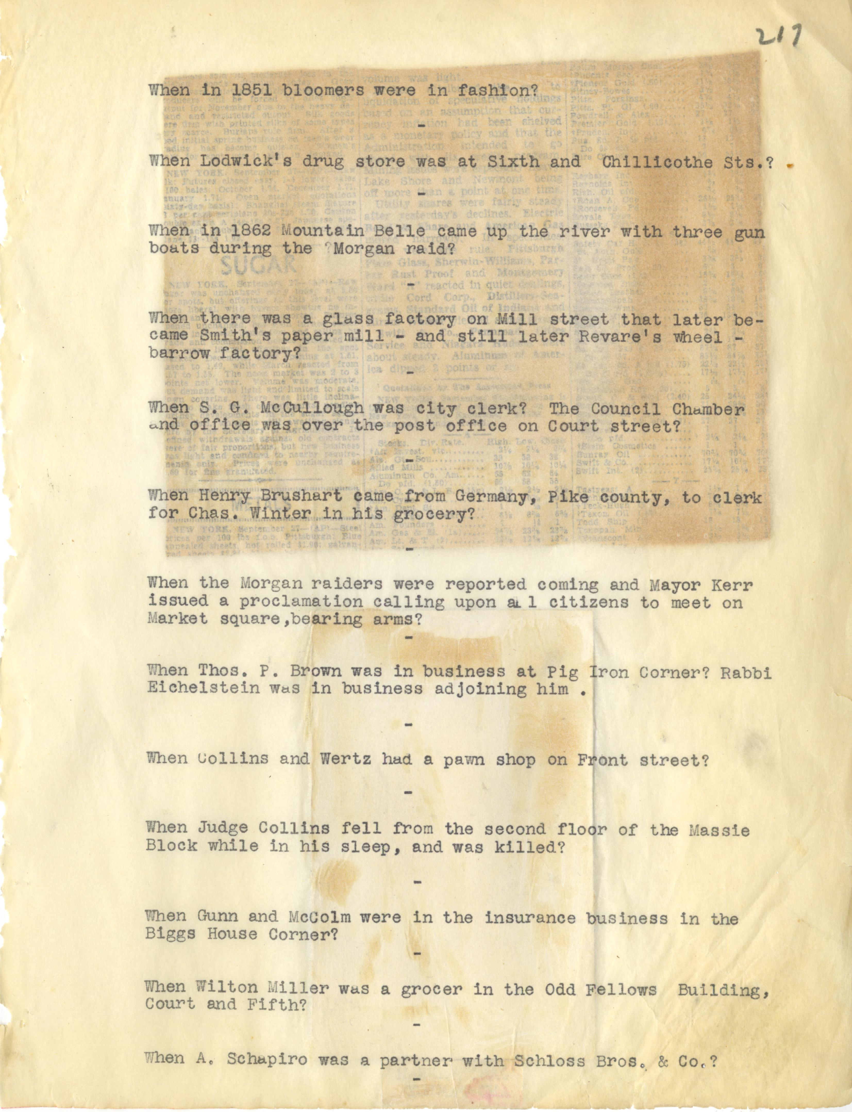 - Photo image of scanned scrapbook page. Pictured: typed page from Do You Remember Continued. Lodwick's Drug Store; Mountain Belle came up the river during Morgan's Raid in 1862; Glass Factory on Mill Street; Smith's Paper Mill; Revare's Wheelbarrow Factory; S. G. McCullough; Council Chamber; Henry Brushart; Charles Winter; Morgan's Raiders; Mayor Kerr's proclamation; Thomas P. Brown; Pig Iron Corner; Rabbi Eichelstein; Collins and Wertz; Judge Collins; Massie Block; Gunn and McColm Insurance in the Biggs House Corner; Wilton Miller; Odd Fellows Building; A. Schapiro was a partner with the Schloss Bros. & Co.